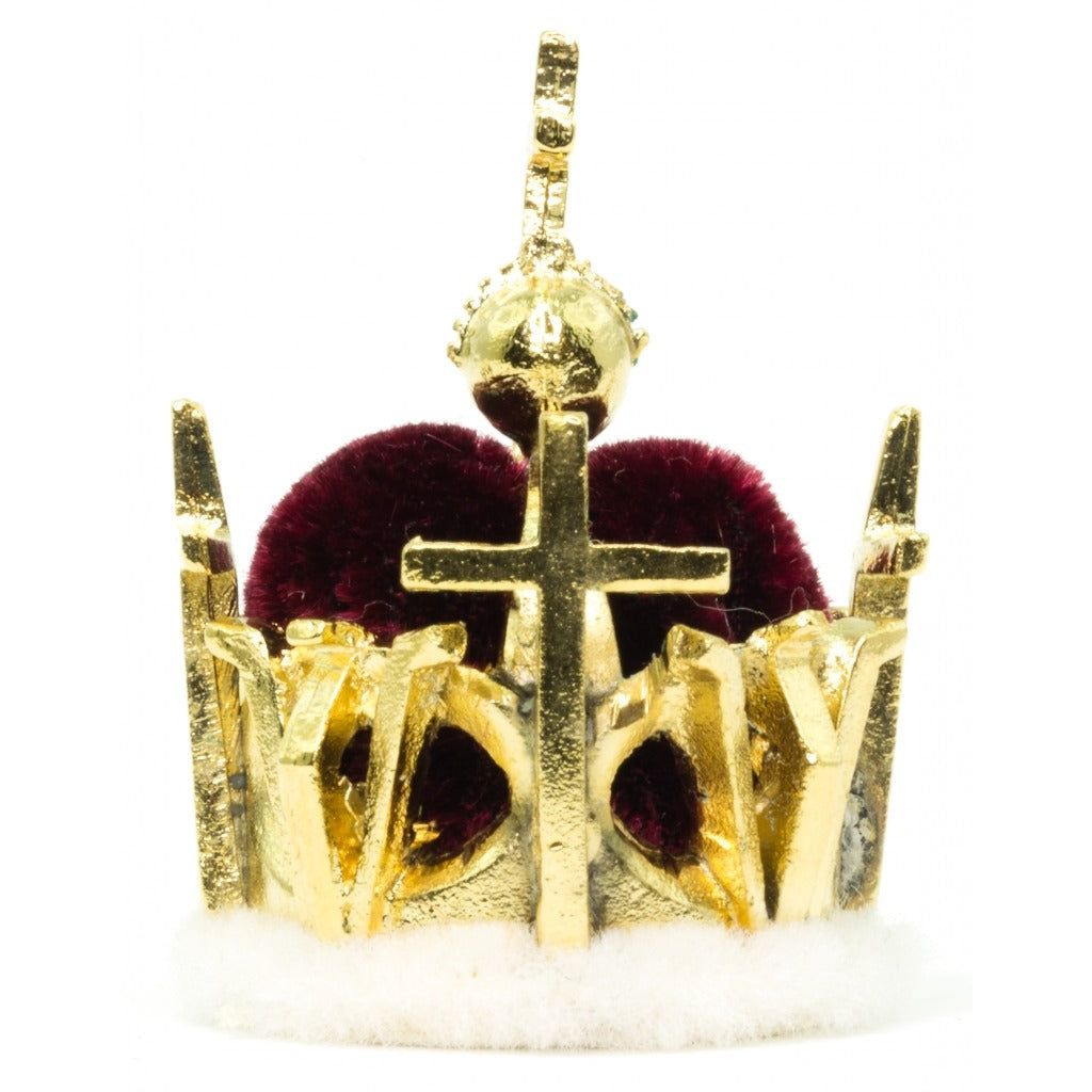 This Crown was a gift in 1969 from the Worshipful Company of Goldsmiths. It was designed and made by Louis Osman, using a new technique of applying gold to a resin base by electrolysis. The main body of the coronet beard four crosses pattee and four fleur de lis made of Welsh gold. Set with seventy five diamonds and twelve emeralds, the single arch of the coronet is surmounted by a symbolically engraved orb featuring a Welsh dragon, the corn stooks of the Earl of Chester, feathers of the Prince of Wales and bezants of the Duke of Cornwall.
