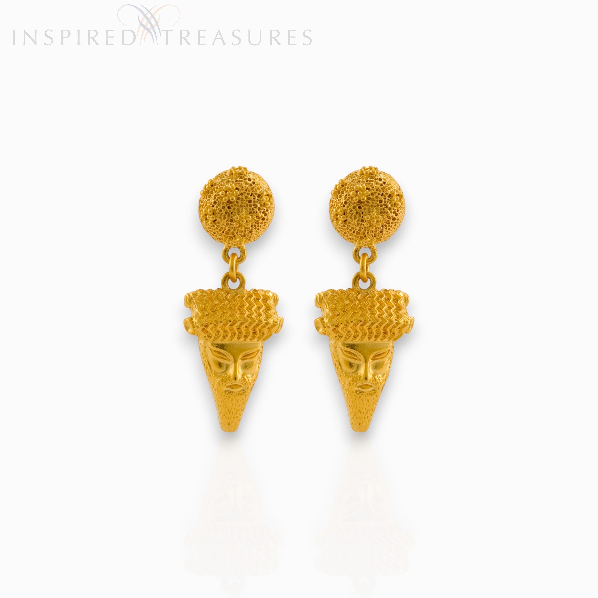 Achelous range - in Greek mythology Achelous was a god often depicted simply as a bearded mask. These eye-catching earrings are inspired by a necklace with that motif by Carlo Giuliano, London, circa 1865, and are 24 ct matt gold-plated.