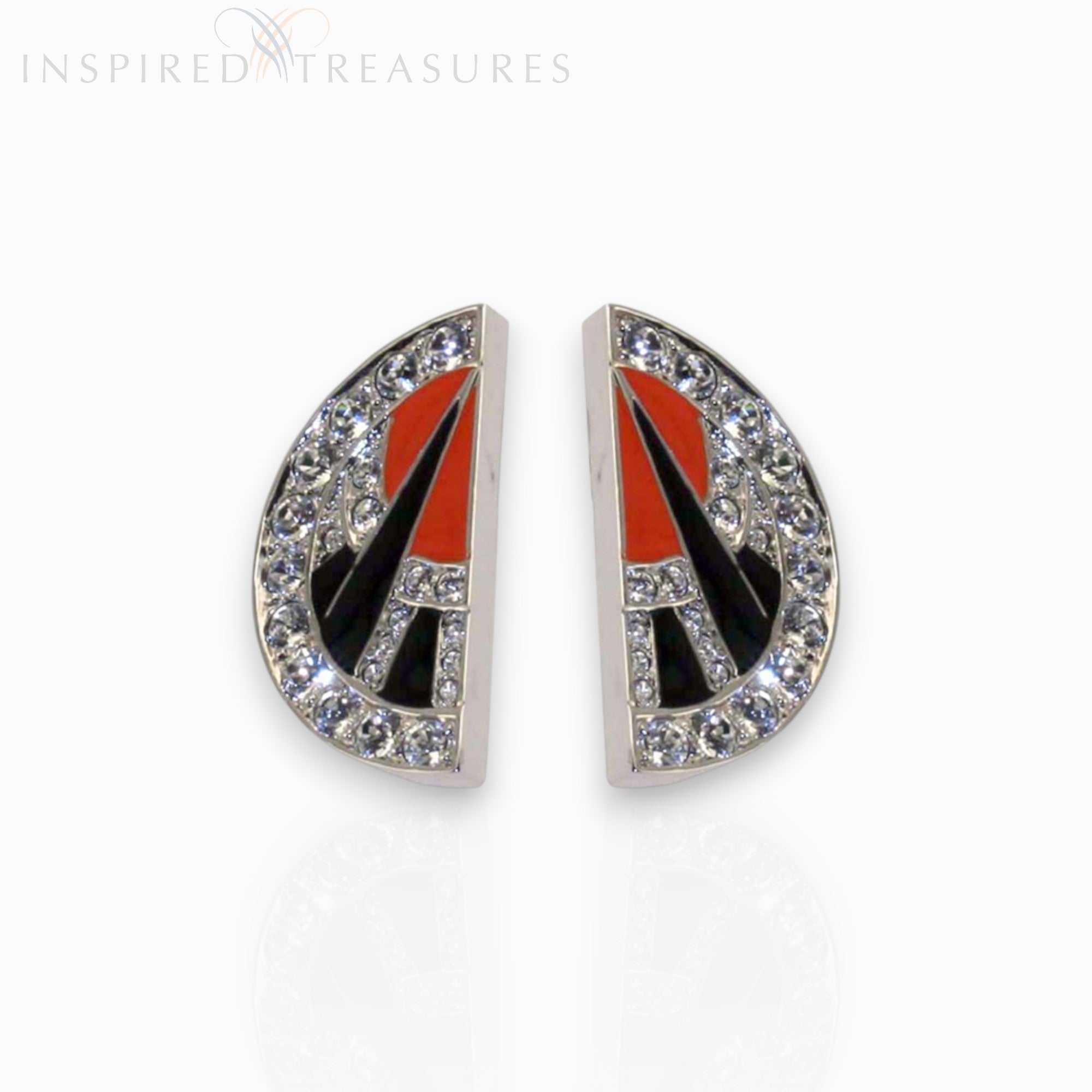Art Deco Fan-shaped Clip-On Earrings: Inspired from an Art deco fan-shaped Jabot pin which was platinum set with coral, onyx and brilliant-cut diamonds, made by an unknown jeweller either in Europe or the USA between 1920-1930. A Jabot is a style of necktie on a woman's blouse that was fashionable in the 20s and 30s and this pin would have been used as a decorative fastening on the jabot.