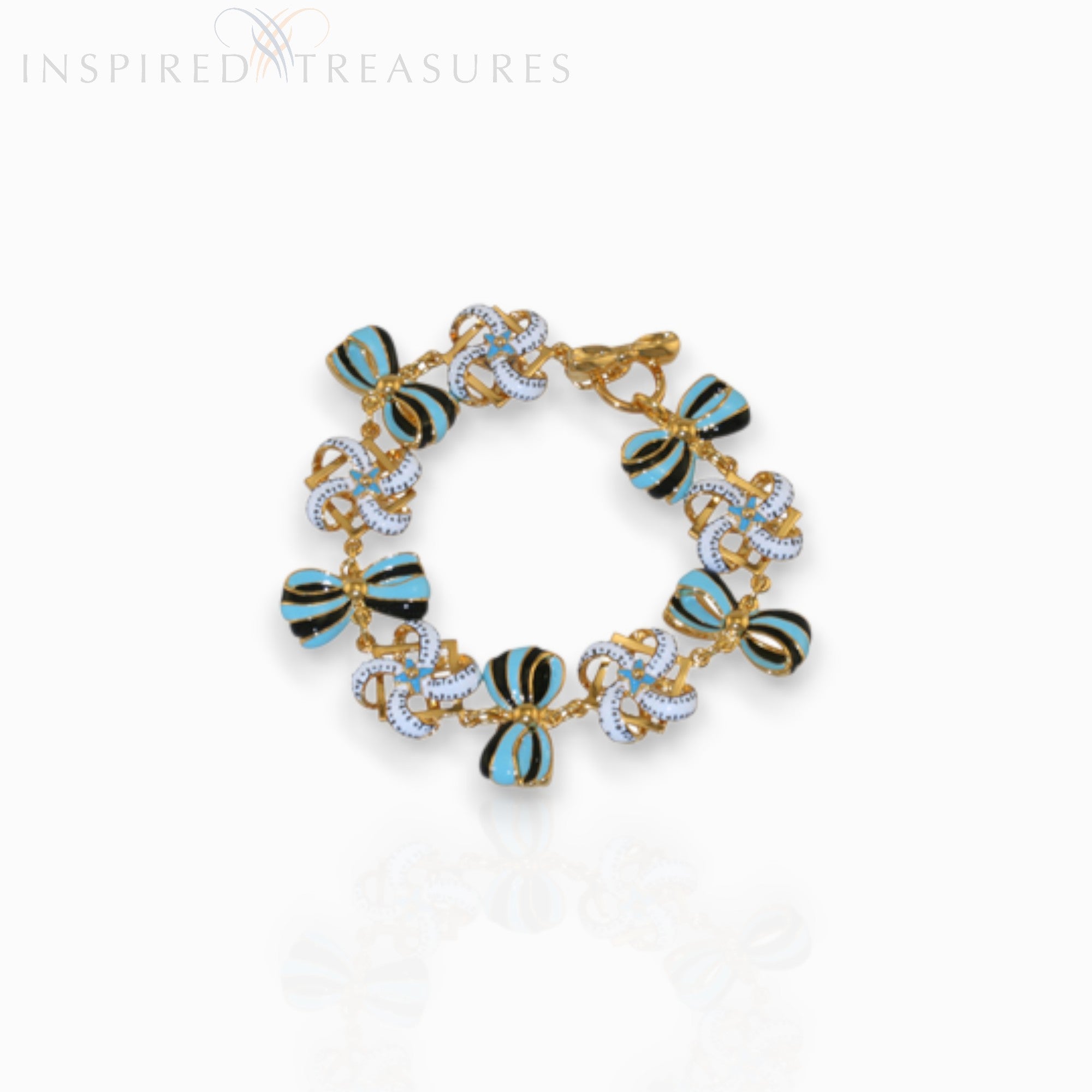 Blue Bows Bracelet: The Blue Bow collection is inspired by an original necklace from around 1660, probably French, with a series of interlinking gold knots, lies behind the appeal of this variation. The lovers' knot is a recurring motif in jewellery design. This piece is gold-plated and hand enamelled.
