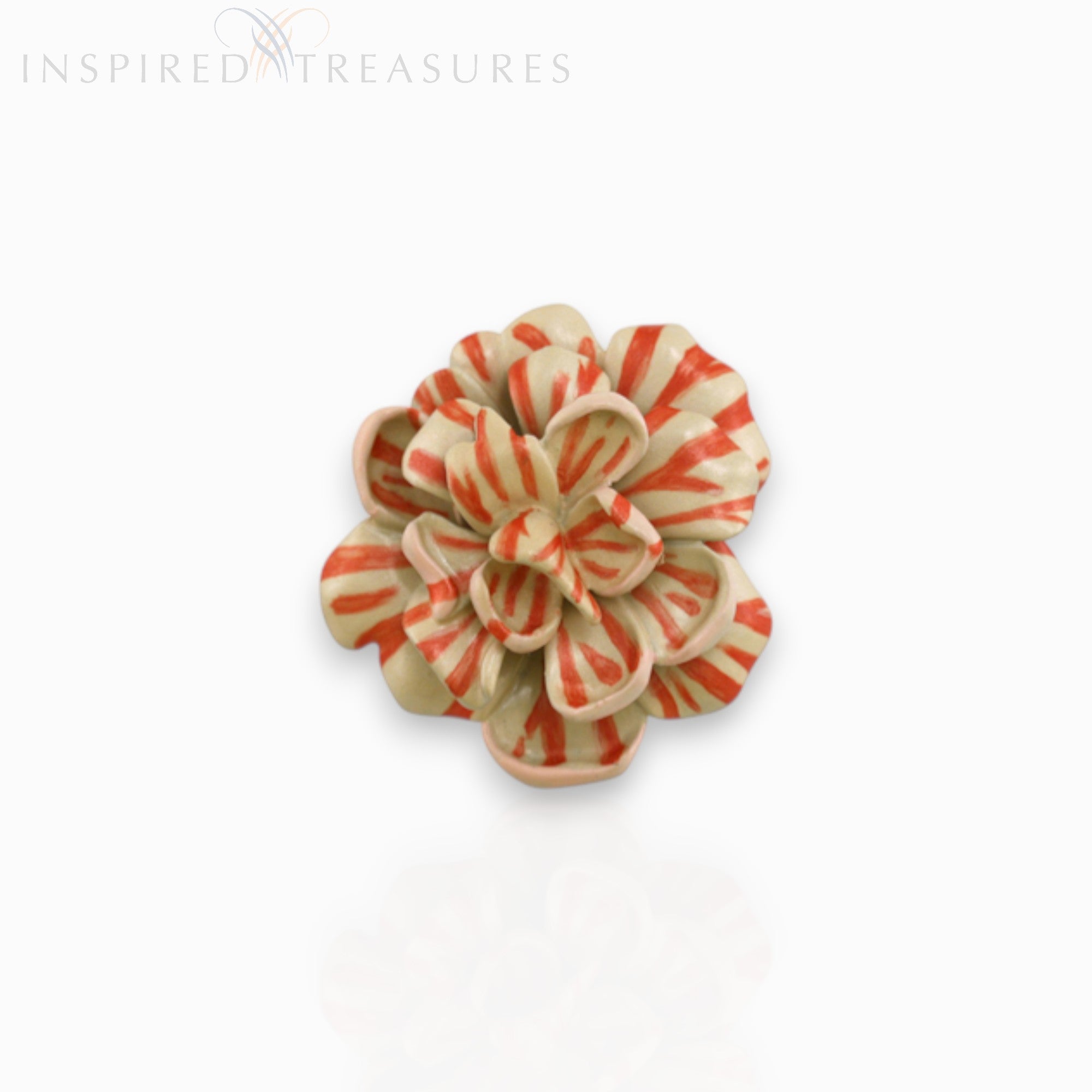 This brooch is based on the Dianthus caryophyllus- Commonly known as the clove pink. It has been cultivated for millennia, valued for its warm spicy fragrance. They are called pinks because of the frilly petal edges that appear to have been cut by pinking shears. This brooch is inspired by artwork by Caroline Maria Applebee (c.1799-1854)- Very little is known about Miss Applebee, like so many women artists of the time. She was an extremely talented amateur artist whose works went unpublished. Her paintings feature a large range of plants, including many more rare and exotic varieties of the day that would only survive under glass.