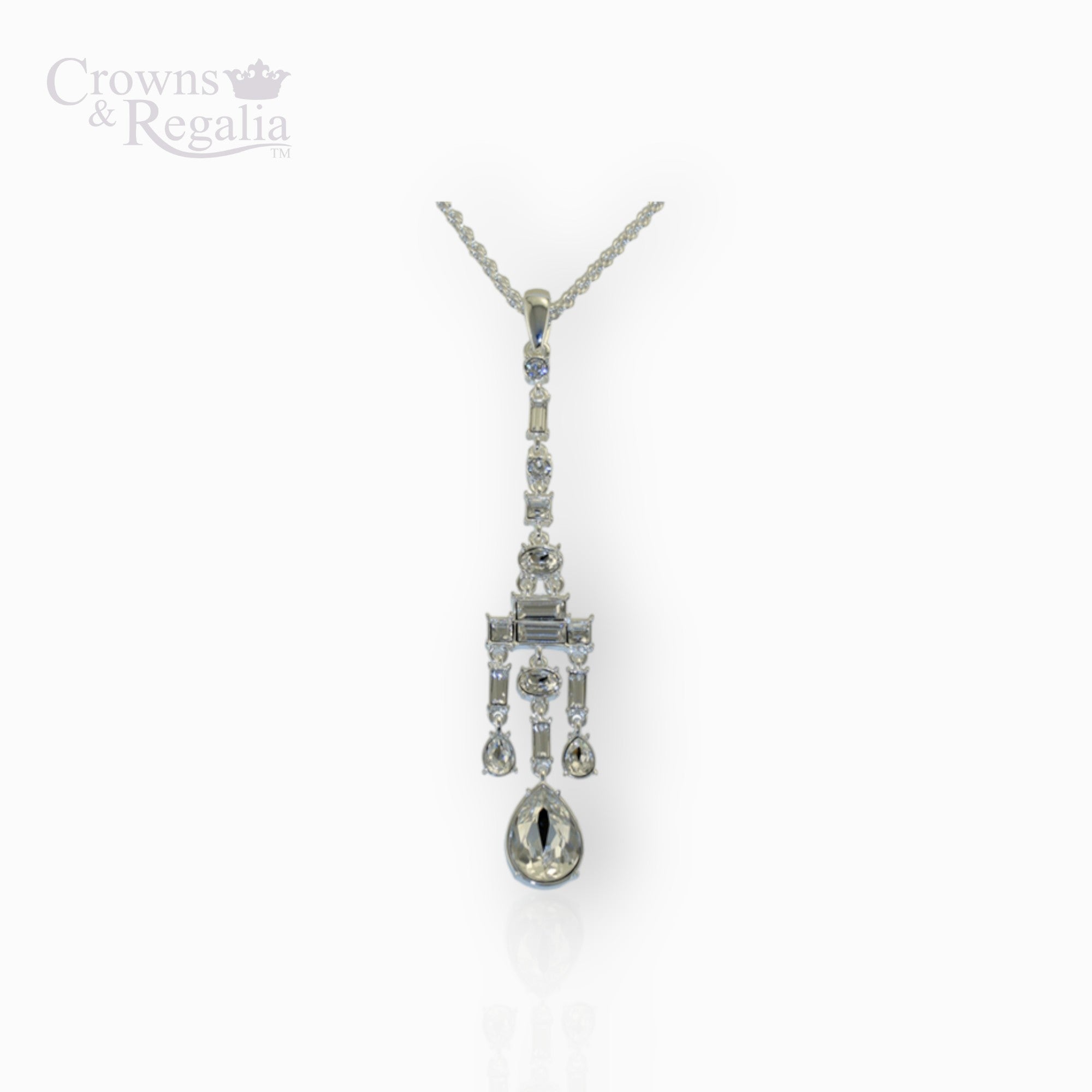 Inspired by earrings that feature every known cut of diamond. Queen Elizabeth the Queen Mother whilst Queen Consort had inherited them from a good friend, the Hon. Mrs. Ronnie Greville in 1942. The Queen then gave them to her daughter, the then-Princess Elizabeth in 1947 as a wedding present. The princess could not wear them until she had her ears pierced, and when it was noticed that she had, women everywhere flocked to their doctors and jewellers to have their ears pierced as well! This pendant is silver-toned and adorned with many bohemian crystals.