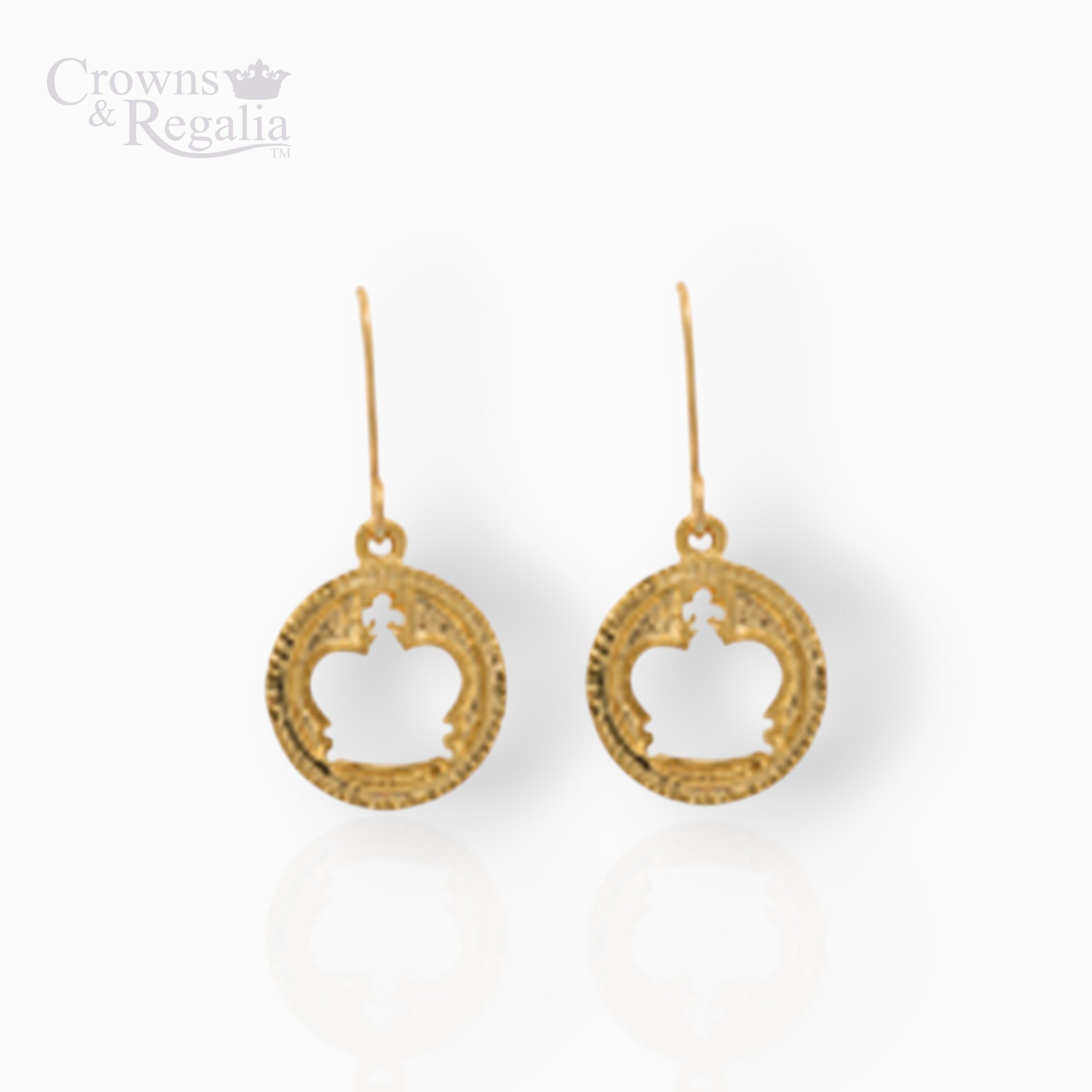 These earrings detail the silhouette of a crown, inspired by the crown jewels housed in the Jewel House at the Tower of London. These dangle earrings are comfortable and allow the gold-toned crown silhouette to move freely.