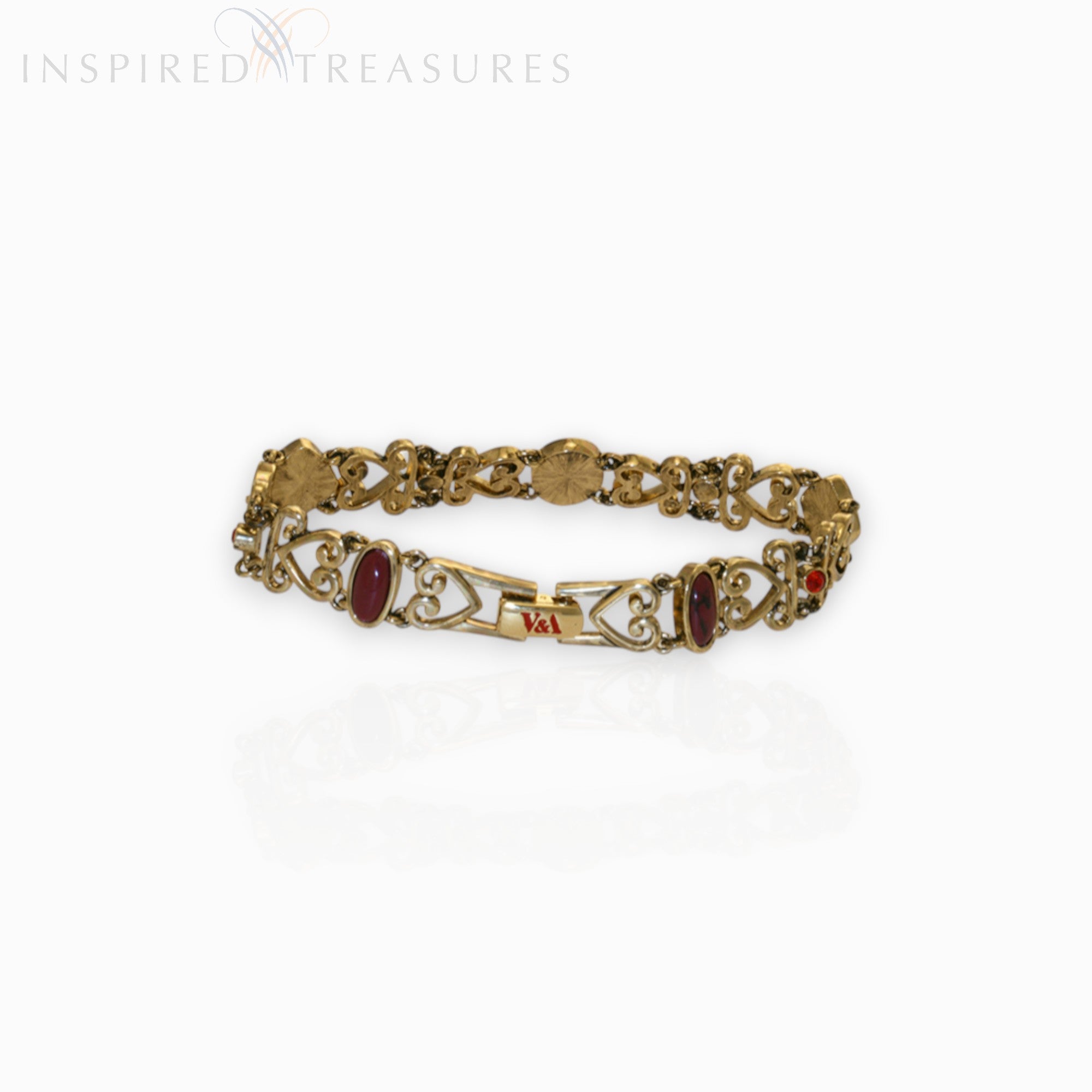 Crystal love range - a bold design taken from a 1903 necklace designed by Charles Robert Ashbee, this decorative bracelet boasts alternating heart shapes and blood red faux stones and complements the earrings, pendant and bracelet in the same range. It is 24 ct matt gold plated with an antiqued finish. A strong, distinctive design for any occasion.