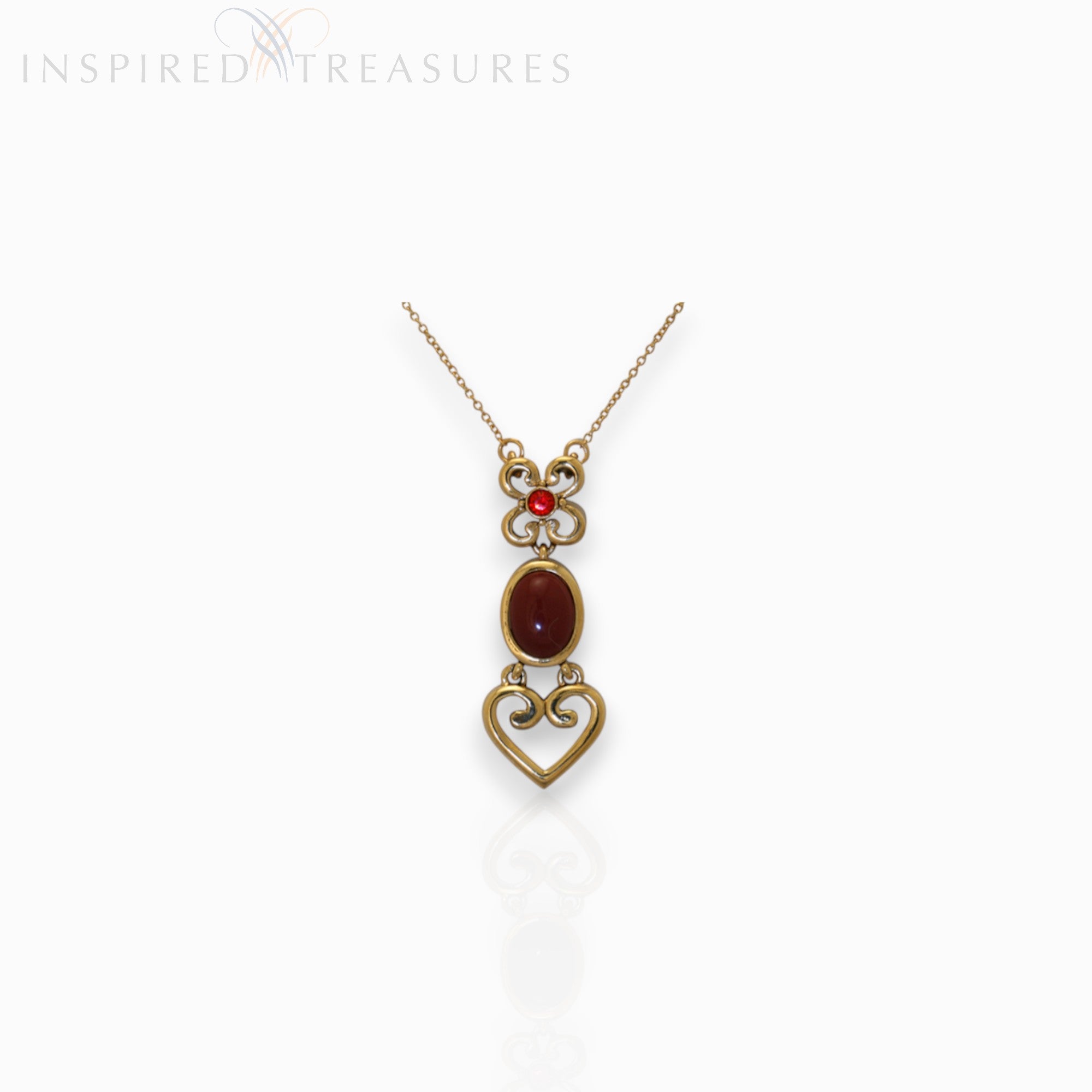 Crystal love range - a bold design taken from a 1903 necklace designed by Charles Robert Ashbee, this magnificent pendant boasts a large blood red faux stone; it is 24 ct matt gold plated with an antiqued finish. A strong, distinctive design with just a hint of theatricality for that special occasion.