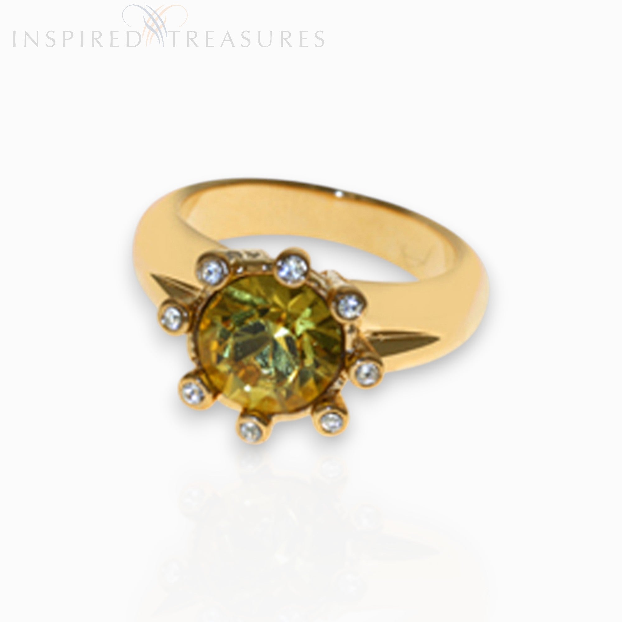 Eight-star Citrine Crystal ring: Inspired by a mid-1800s gold ring set with a brilliant-cut diamond in a silver claw mount. Diamonds are most commonly associated with romance: the Greeks believed diamonds were the tears of gods; the Romans believed they were splinters of fallen stars. This citrine ring is gold-toned with bohemian crystals. It comes in four sizes from small to extra large.