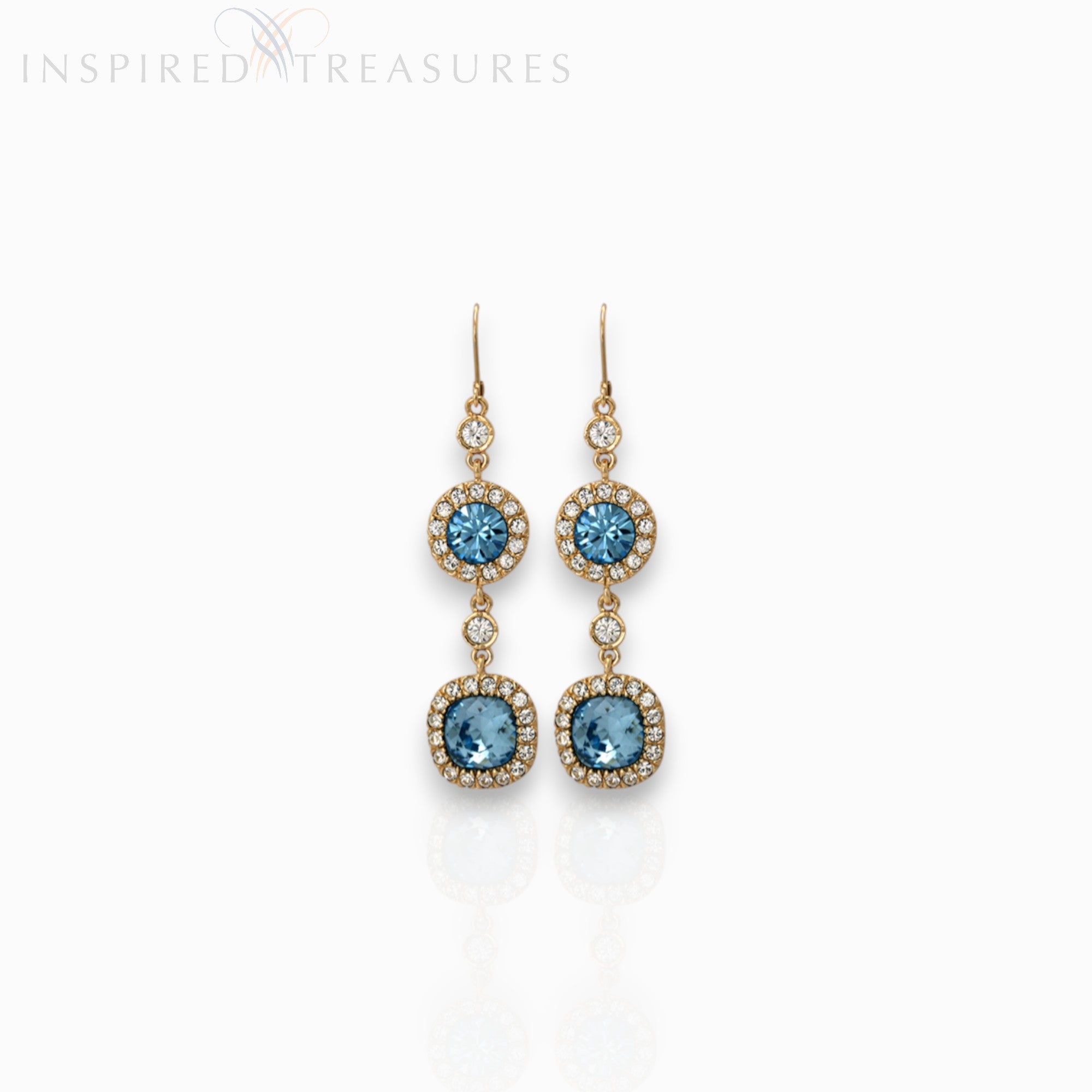 English Blue Crystal Earrings: English blue crystal range - taken from an English design dating from 1810, these pale blue crystal earrings are the height of understated glamour and elegance. The fashion in 1810 was for low sweeping necklines but the matching necklace works equally well with higher necklines. The earrings are gold-plated with generously cut aquamarine Bohemian Crystals Bohemian Crystals, matching the necklace.
