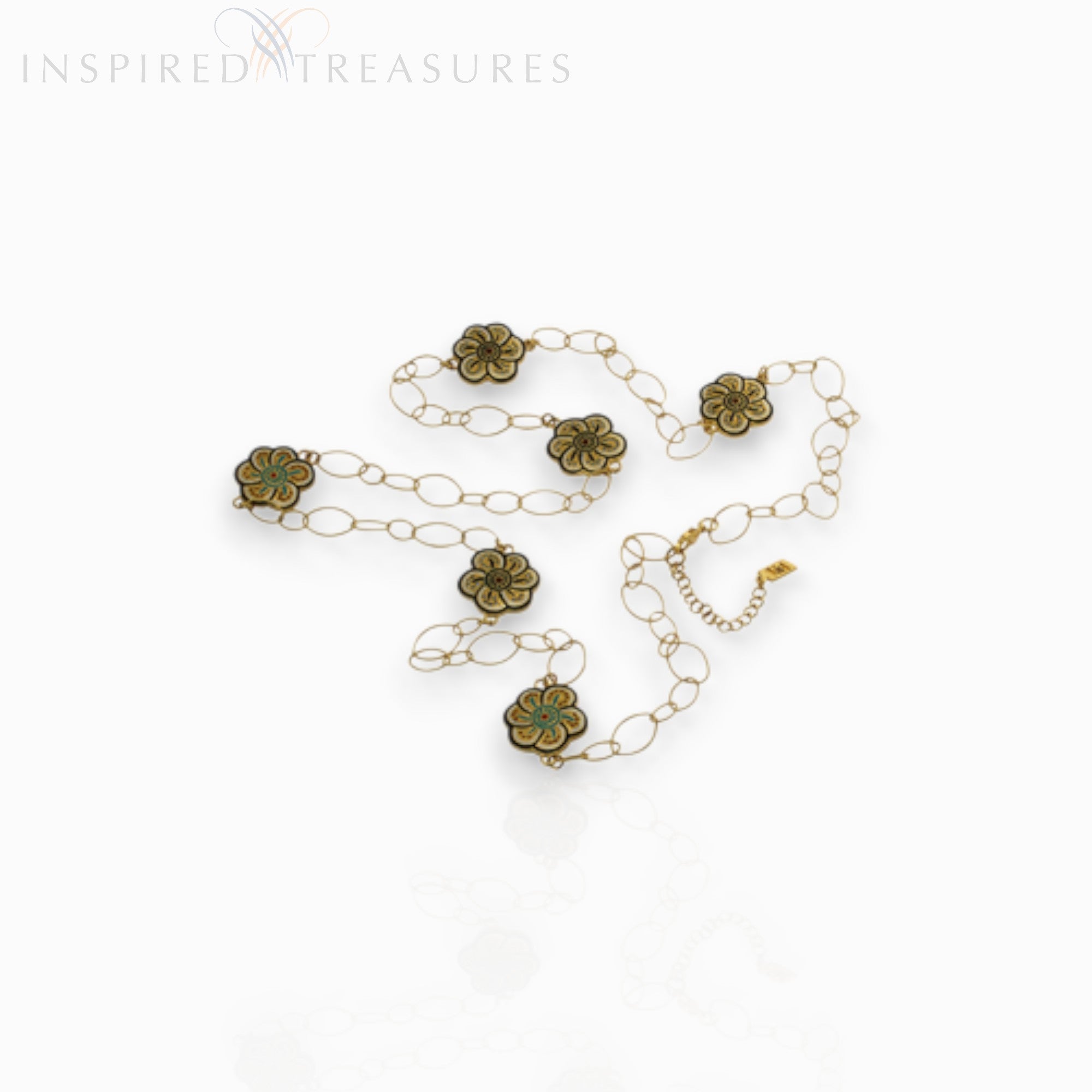 These pieces are 24ct matt gold-plated with a double-sided hand-enamelled finish with plentiful bohemian crystals. They are inspired by an 1890 decorative panel in woven linen, embroidered in wool, designed by George W. Jack (1855 -1932). This range captures the essence of the Arts and Crafts school of design.