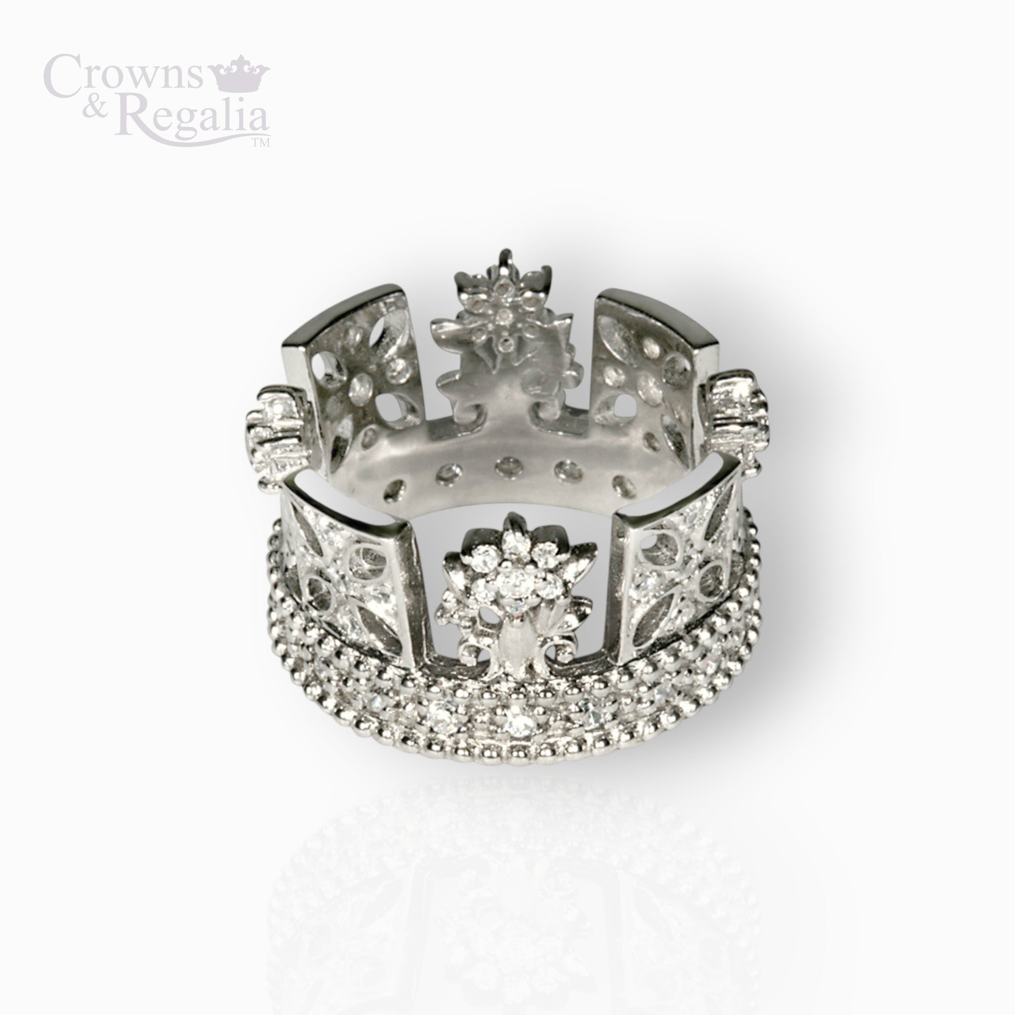 From its frequent appearance on postage stamps and coins, George IV's Diadem, incorporates the national emblems of England, Scotland and Ireland, is one of the most famous crowns. This ring is made from sterling silver and embellished with cubic zirconia.