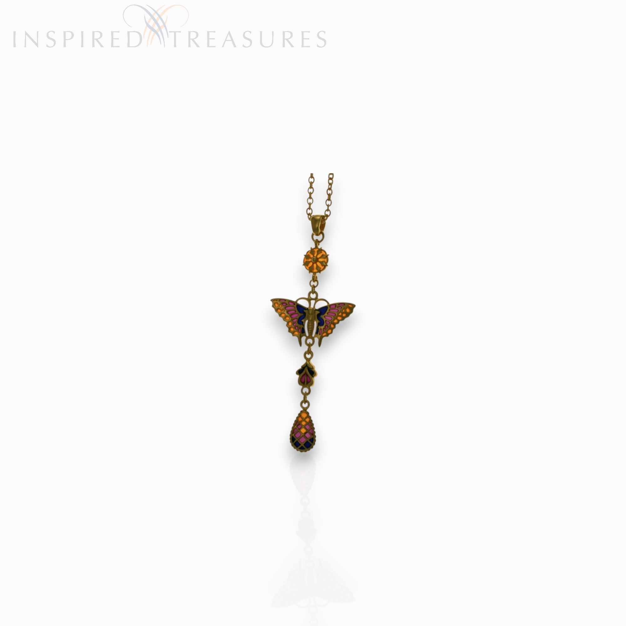 This varied range is taken from a beautiful Prussian earring design, in very delicate cast iron resembling a lace pattern, dating from 1815-51. The pendant consists of a detailed butterfly, floral and droplet designs in transparent coloured enamel and gold-toned pewter. The style is strikingly ornamental yet feminine.
