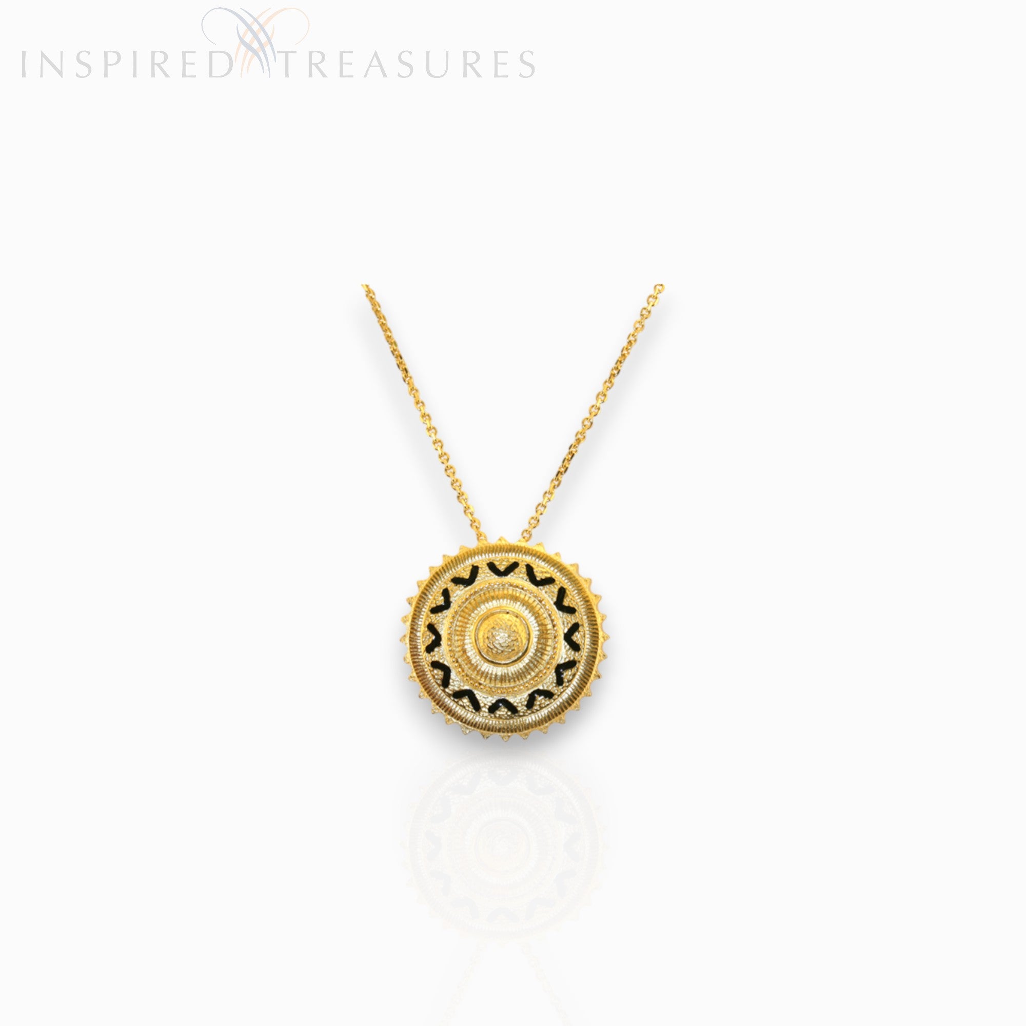 Golden Sun Pendant: Inspired by a stud of a Sun design made by Carlo Giuliano in London between 1865-1870. The granulation, or fine surface texture of minute grains of gold on the original earrings, was copied from the Etruscan technique. Although the precise method not mastered by 19th century goldsmiths a similar effect was achieved. This pendant is 24ct gold-plated and hand enamelled.