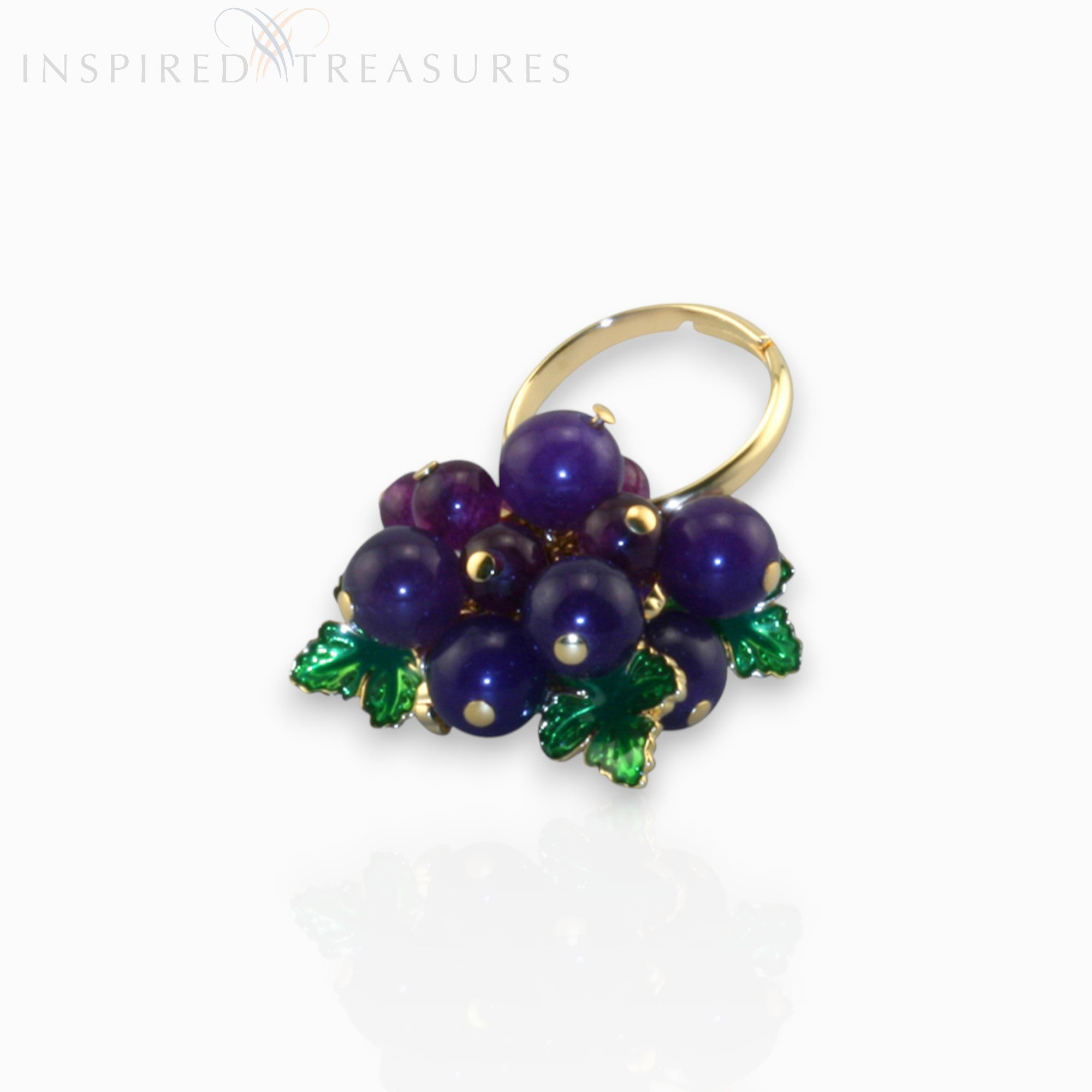 A gold-toned and enamelled ring, perfectly detailed in the form of a bunch of purple grapes and green vine leaves, each element separately attached to give natural movement. This range is based on a mid-19th century French necklace in enamelled gold with carved amethysts.