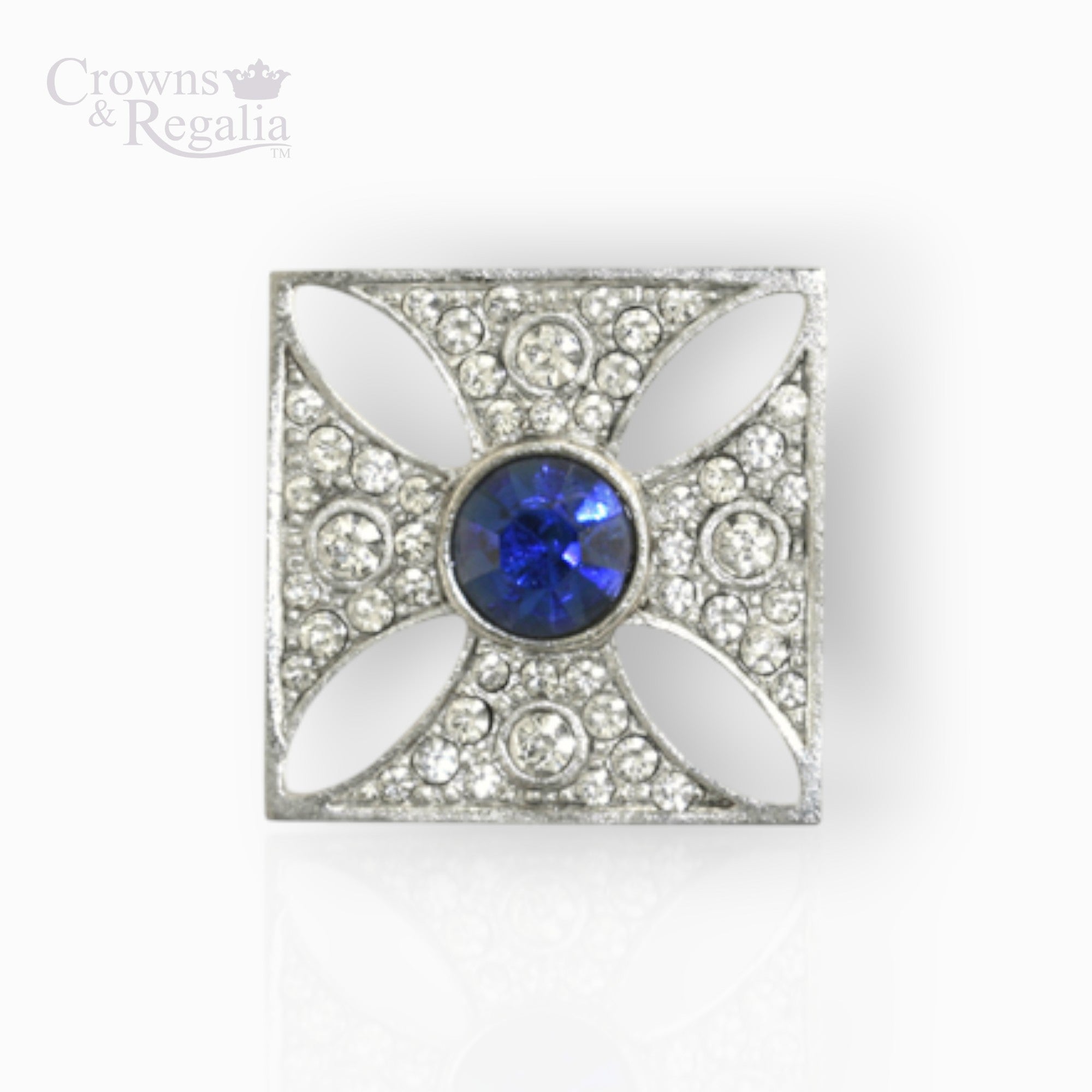This brooch is rhodium-plated and adorned with 68 small bohemian crystals and one large central blue bohemian crystal.