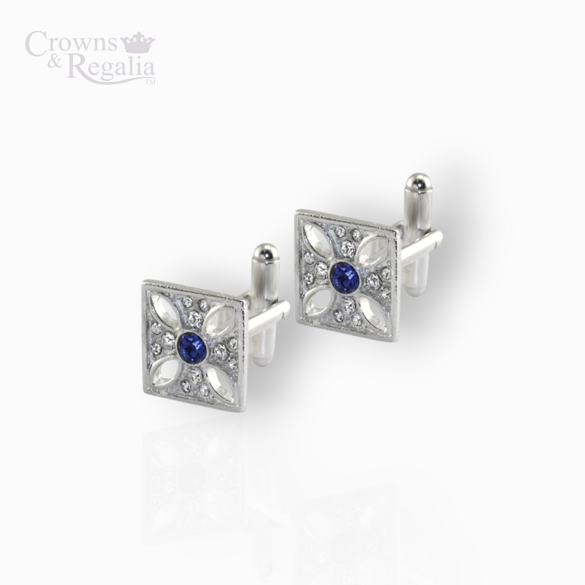 These cufflinks are based on the top cross of the Imperial State Crown. They are rhodium plated and adorned with 40 small bohemian crystals and a central blue crystal. The bullet style backs allow for easy and secure wear.