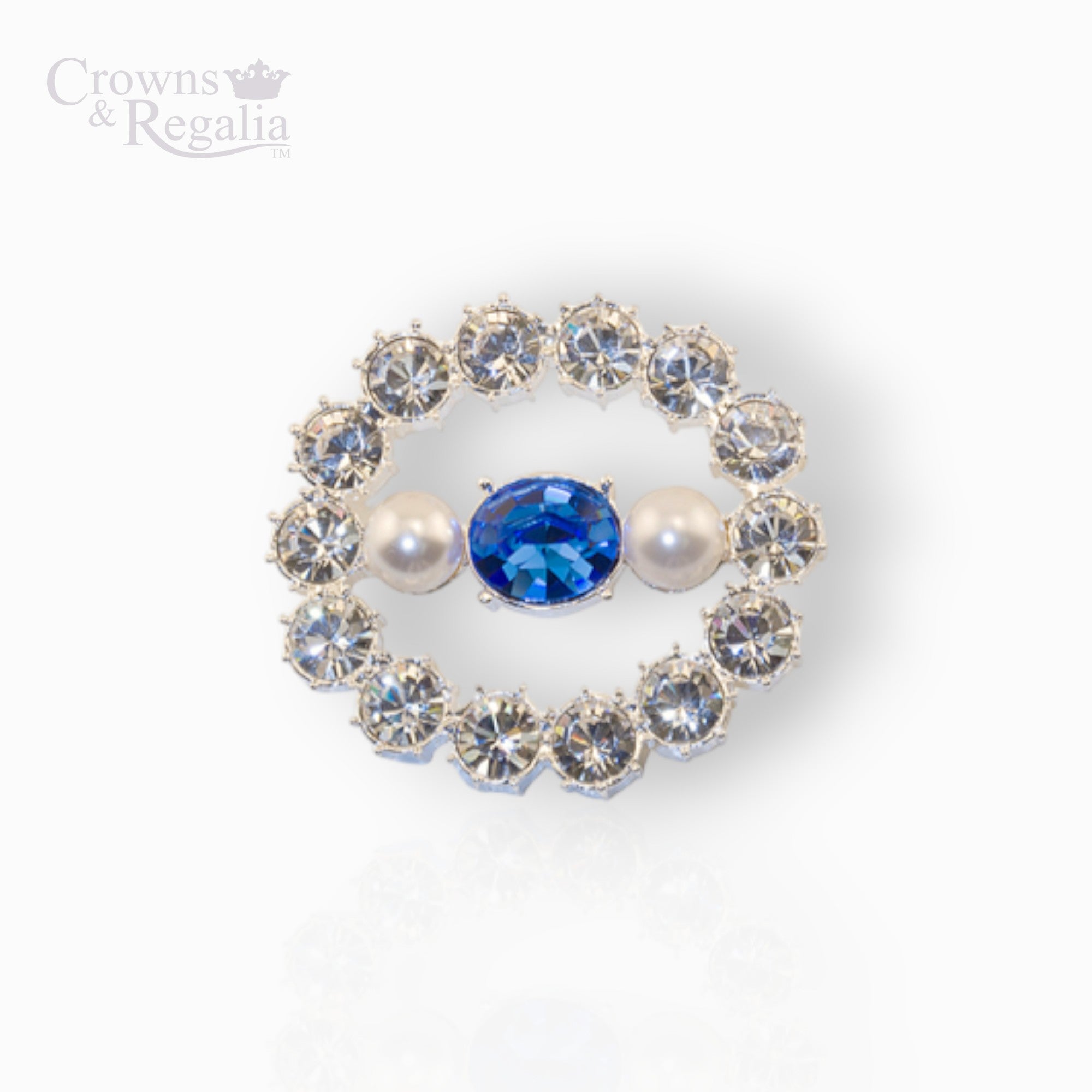 This brooch is made from lead-free pewter and rhodium-plated. It has 14 bohemian crystals around the outside with 2 faux pearls and a large blue bohemian crystal in the centre. It has a locking C clasp back to ensure secure fastening.