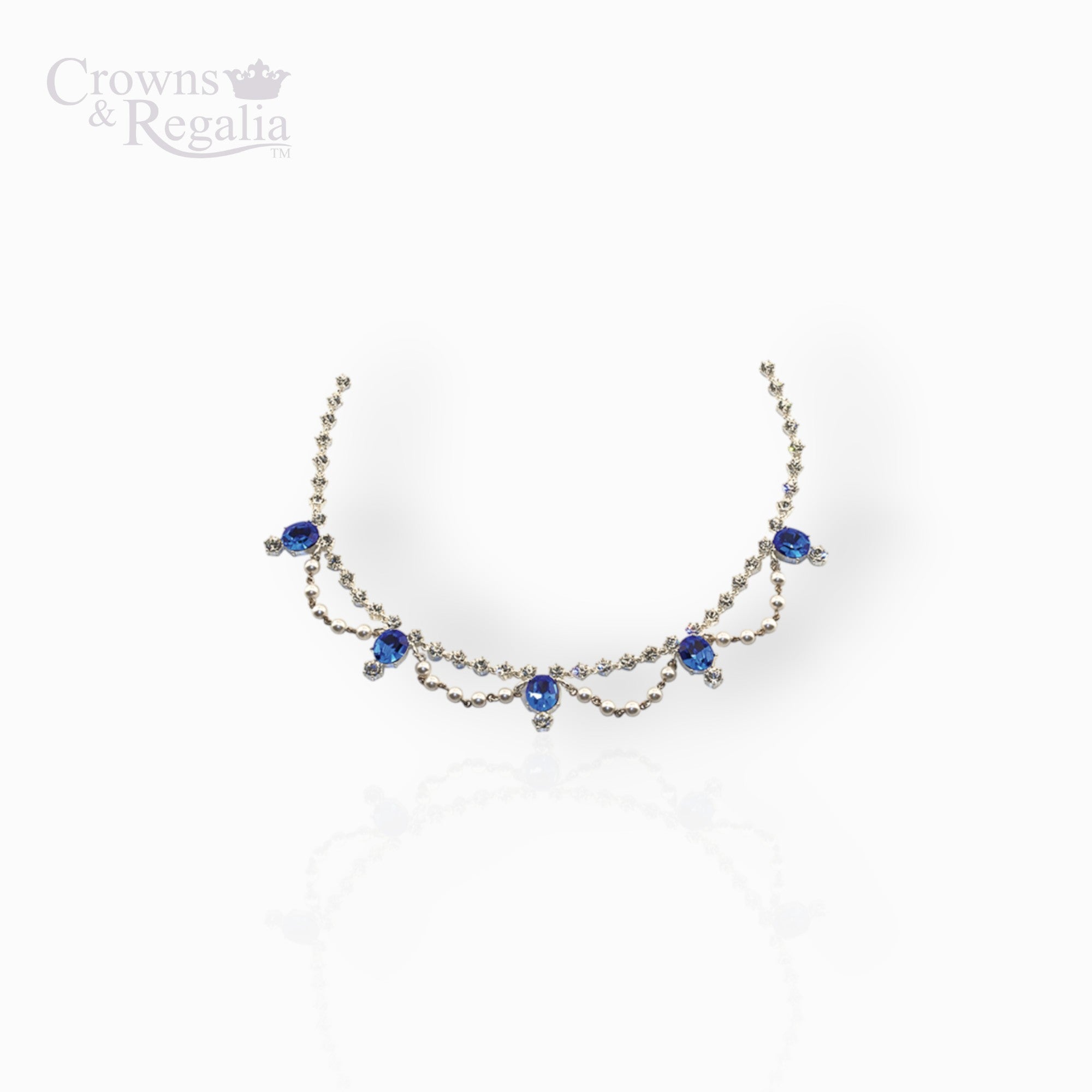 This set of jewellery is inspired by the motif appearing just above the lower band of the Imperial State Crown. The best known of all the crowns, the present Imperial State Crown was originally designed and made for Queen Victoria's Coronation in 1838 by Rundell, Bridge and Rundell, the Crown Jewellers. This crown was used at the Coronation of King Edward VII and King George V. It was remade with practically the same stones for King George VI in 1937. For the Coronation of Queen Elizabeth II in 1953 the shapes of the arches were altered to reduce the height. The jewels symbolise a lot more than precious stones, they represent virtues that a monarch should have. Pearls represent divine power, sapphires symbolise purity, chastity and sincerity and diamonds represent power, strength and courage. The crown itself is mounted in gold and silver. It weighs 2 pounds 13 ounces and is set 2,868 , 17 sapphires, 11 emeralds, 5 rubies and 273 pearls. The most important and mystical of these stones are, St Edward's Sapphire. This is a square sapphire set in the top cross. This sapphire is said to have been taken from a ring found on the finger of Edward the Confessor by Abbot Lawrence on 13th October 1163, when the body was being reinterred in Westminster Abbey. Henry II was present at the time. It was presented to the King, and it has been used by the Monarch ever since.