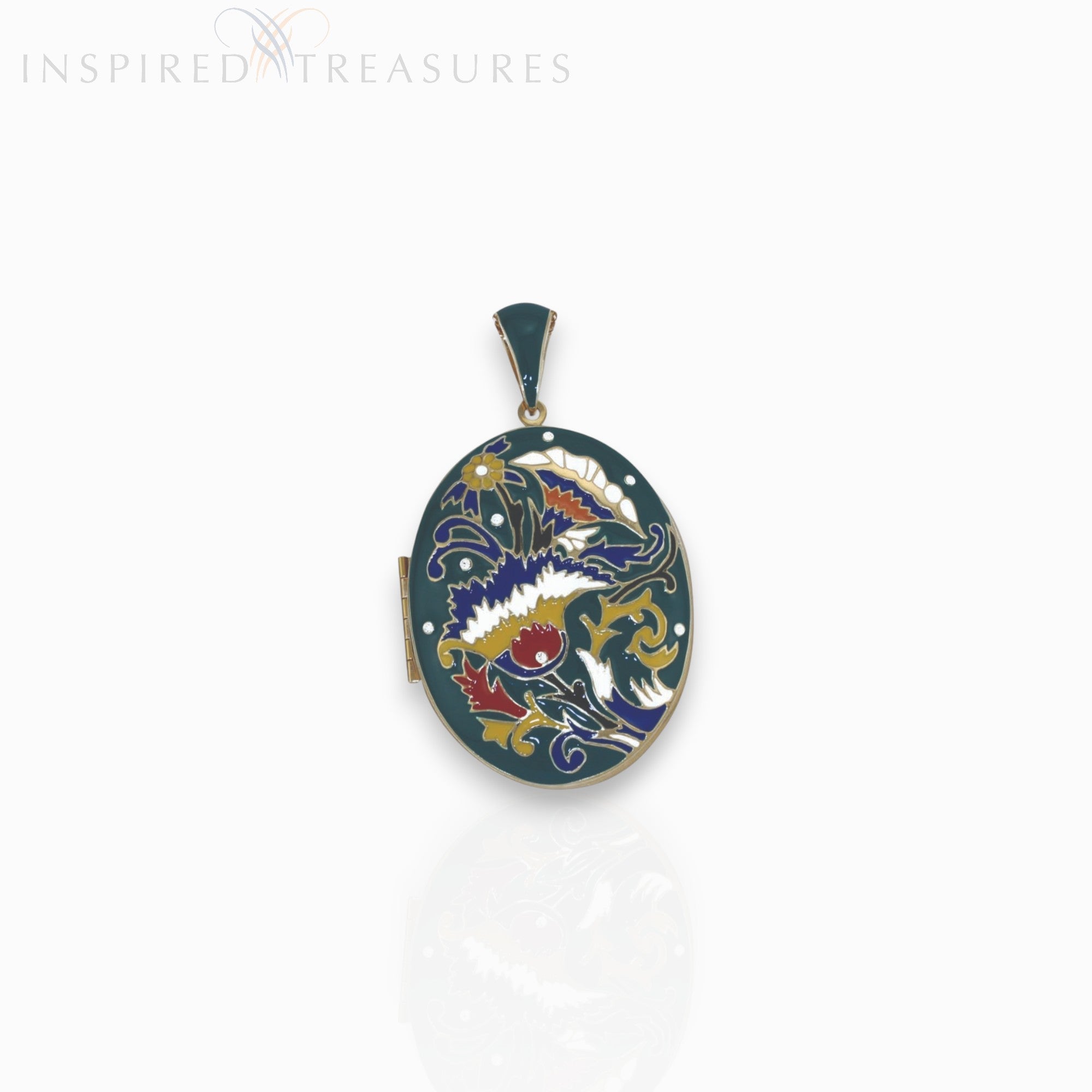 This enamel floral pendant is inspired by an 1870 locket made by Alexis Falize. The original locket was decorated with Indian motifs in cloisonne enamel and shown at the International Exhibition in London in 1871.