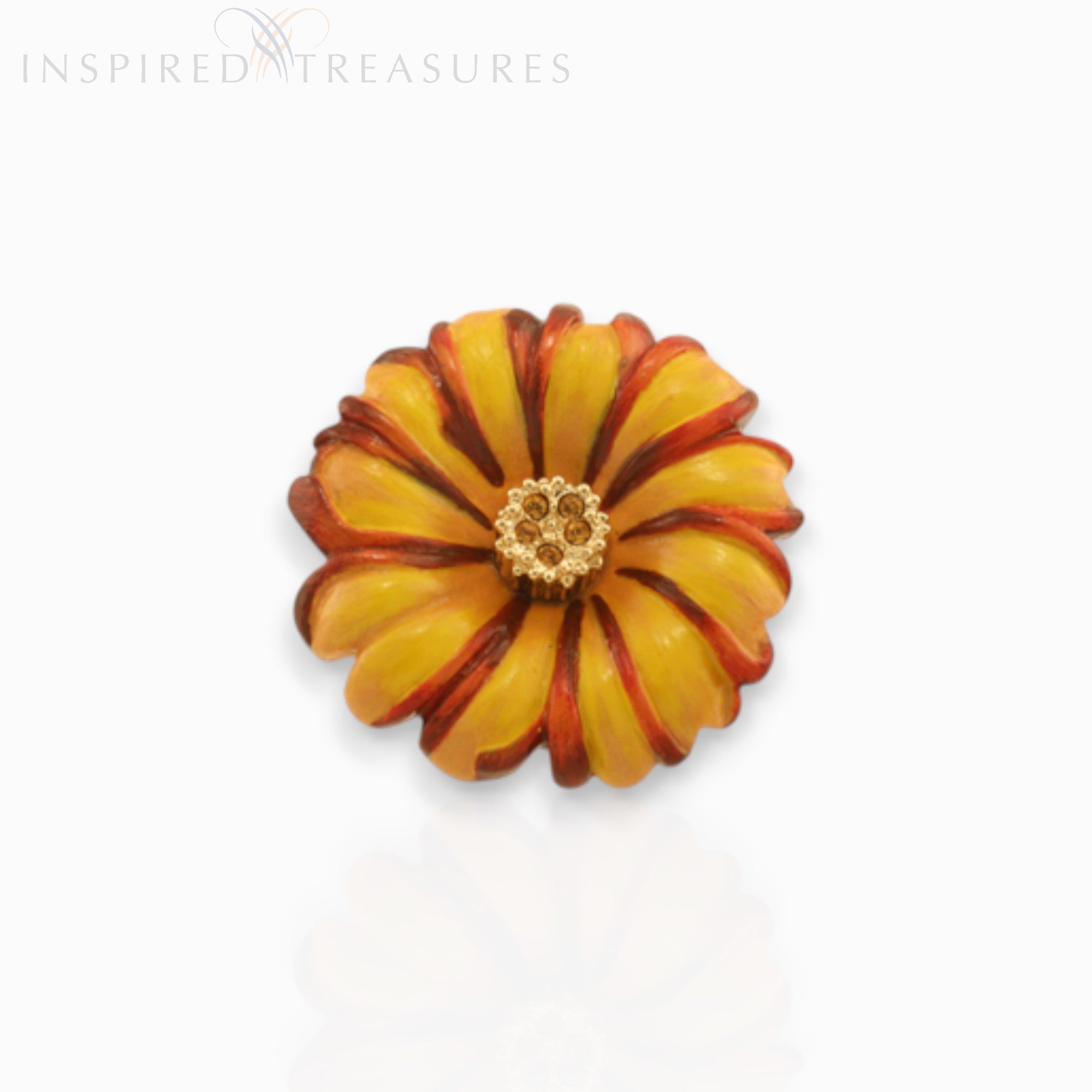 This small marigold brooch has brightly coloured hand-enamelled details, is gold-toned and adorned with bohemian crystals to create a beautiful lifelike floral brooch. This brooch is based on the Tagetes patula- The French marigold is a member of the daisy family (Asteraceae) and originates in South Africa. The entire plant is harvested for its scent. In perfumes, it is mixed with sandalwood to produce the fragrance ‘attar genda’. This brooch is inspired by a painting by Caroline Maria Applebee (c.1799-1854)- Very little is known about Miss Applebee, like so many female artists of the time. She was an extremely talented amateur artist whose works went unpublished. Her paintings feature a large range of plants and flowers, including many rare and exotic varieties of the day that would only survive under glass.