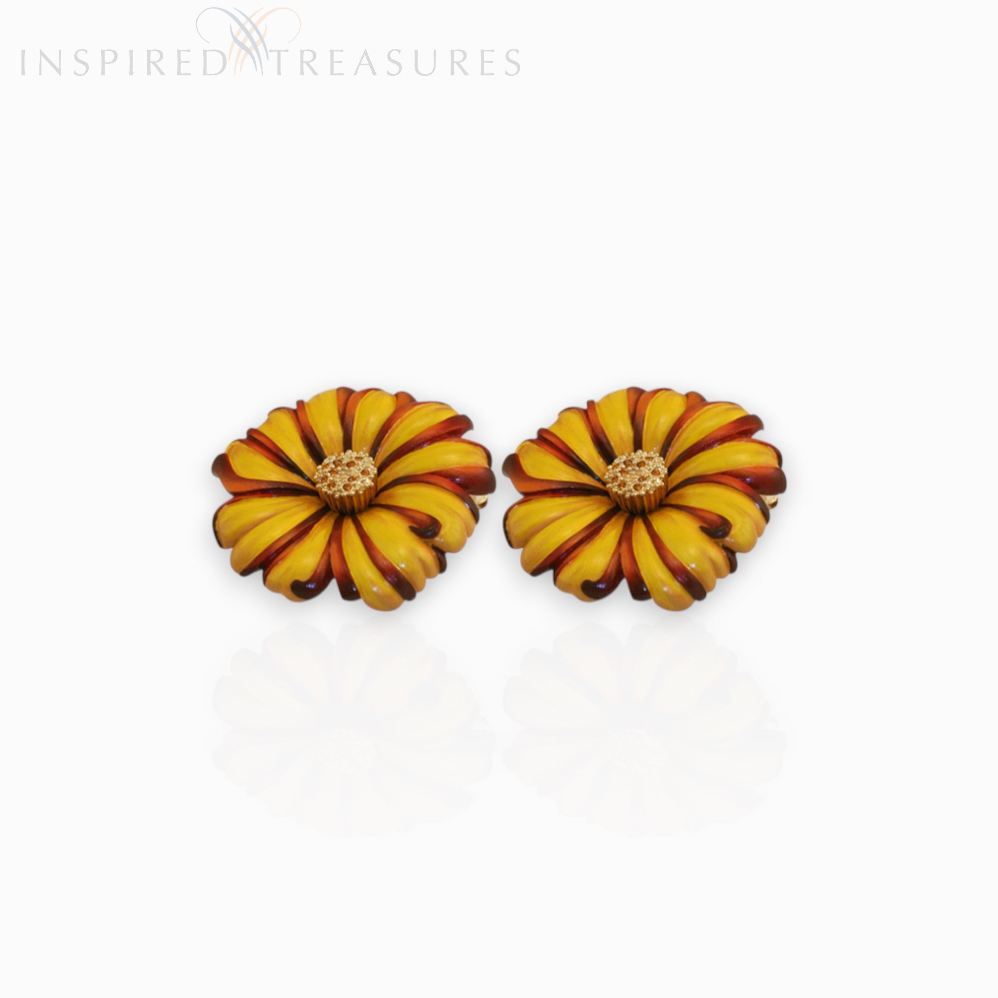 These earrings are gold-toned, hand-enamelled and embellished with 5 bohemian crystals. They are based on the Tagetes patula- The French marigold, which is a member of the daisy family (Asteraceae) and originates in South Africa. The entire plant is harvested for its scent. In perfumes it is mixed with sandalwood to produce the fragrance ‘attar genda’. These earrings are inspired by a painting by Caroline Maria Applebee (c.1799-1854)- Very little is known about Miss Applebee, like so many female artists of the time. She was an extremely talented amateur artist whose works went unpublished. Her paintings feature a large range of plants and flowers, including many more rare and exotic varieties of the day that would only survive under glass.