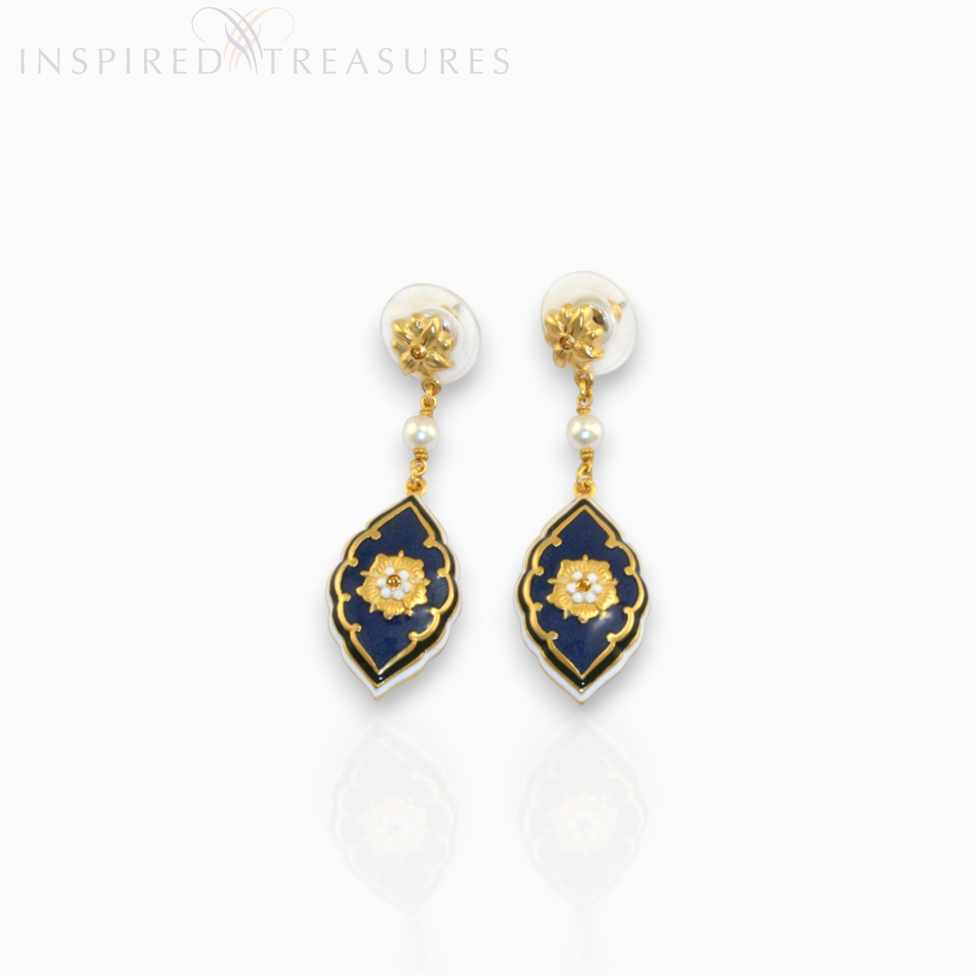 Medieval Floaral Azure Earrings: This jewellery is inspired from a beechwood box made in 1580 in Venice. This box may have been used for combs, brushes and other small personal accessories. Contemporary illustrations show such boxes hung on the wall in a bed chamber beside a dressing mirror with similar decoration. This type of decoration appears to have been a Venetian speciality, found from about 1570 on musical instruments, book-bindings, caskets and frames. The lustrous colours painted on bone (or sometimes mother-of-pearl) emulated the decorated surfaces of imported products which were probably described at the time as alla zemina (in the Persian manner), or petteniera turchesca (in the Turkish manner).