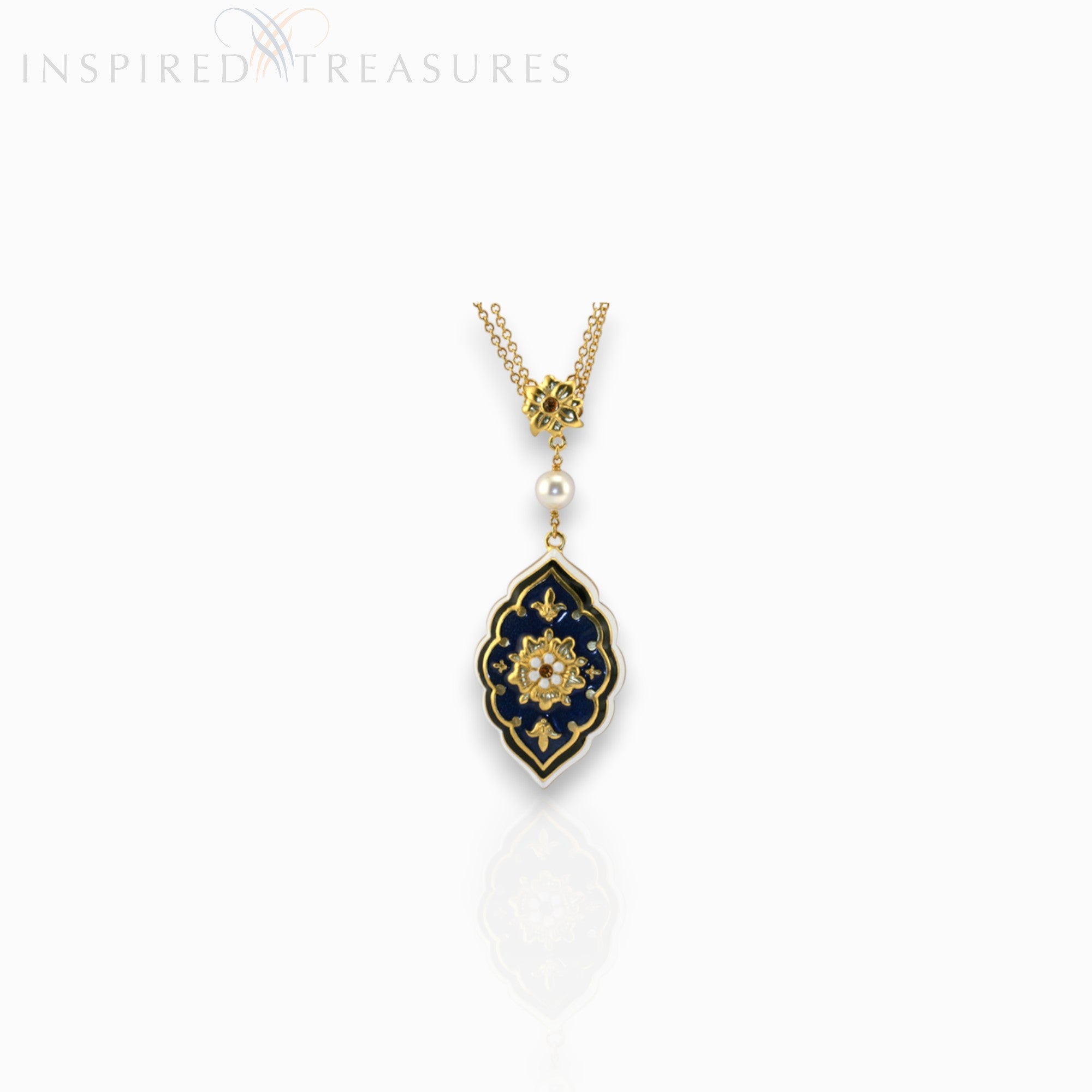 Medieval Floral Azure Pendant: This jewellery is inspired from a beechwood box made in 1580 in Venice. This box may have been used for combs, brushes and other small personal accessories. Contemporary illustrations show such boxes hung on the wall in a bed chamber beside a dressing mirror with similar decoration. This type of decoration appears to have been a Venetian speciality, found from about 1570 on musical instruments, book-bindings, caskets and frames. The lustrous colours painted on bone (or sometimes mother-of-pearl) emulated the decorated surfaces of imported products which were probably described at the time as alla zemina (in the Persian manner), or petteniera turchesca (in the Turkish manner).