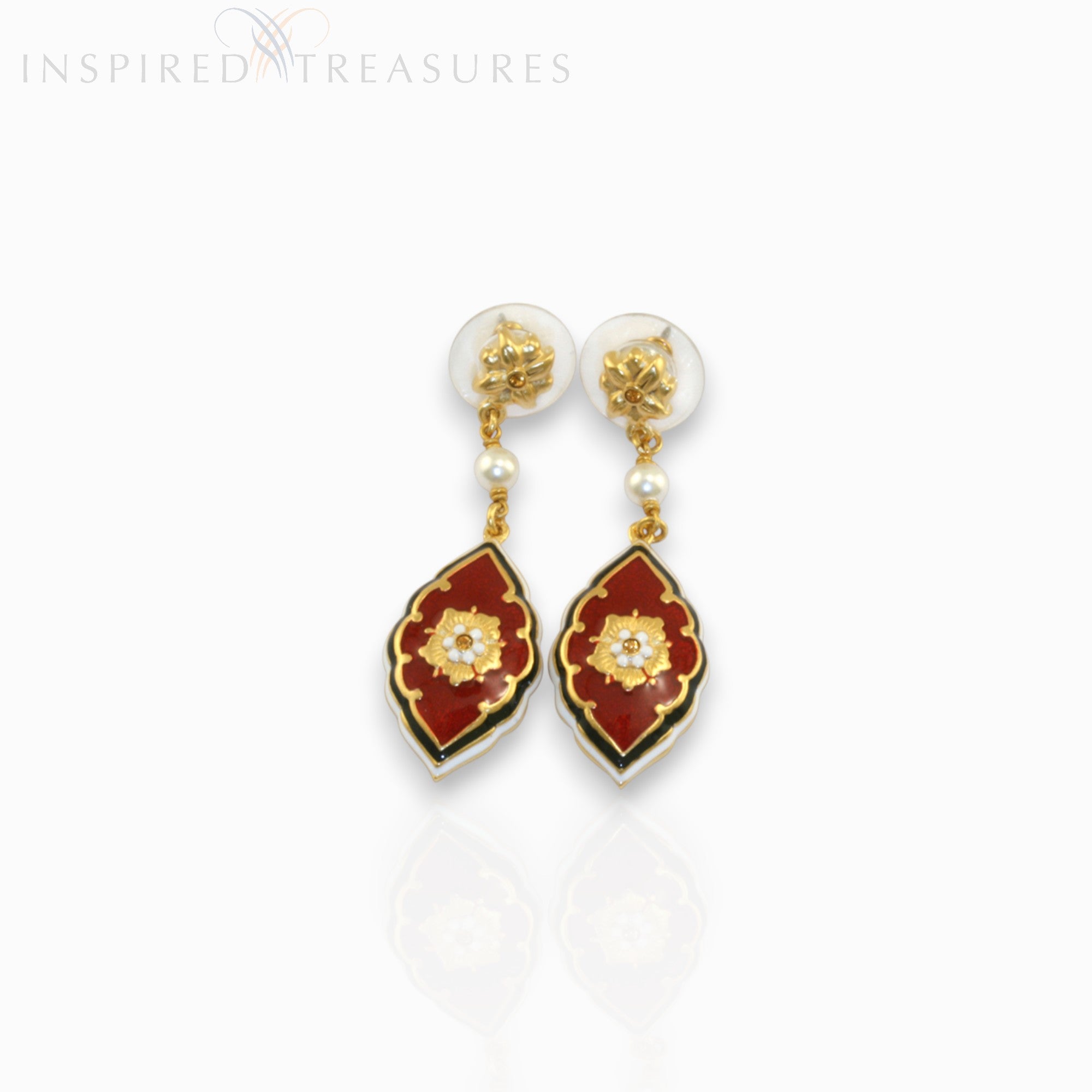 Medieval Floral Rouge Earrings: This jewellery is inspired from a beechwood box made in 1580 in Venice. This box may have been used for combs, brushes and other small personal accessories. Contemporary illustrations show such boxes hung on the wall in a bed chamber beside a dressing mirror with similar decoration. This type of decoration appears to have been a Venetian speciality, found from about 1570 on musical instruments, book-bindings, caskets and frames. The lustrous colours painted on bone (or sometimes mother-of-pearl) emulated the decorated surfaces of imported products which were probably described at the time as alla zemina (in the Persian manner), or petteniera turchesca (in the Turkish manner).