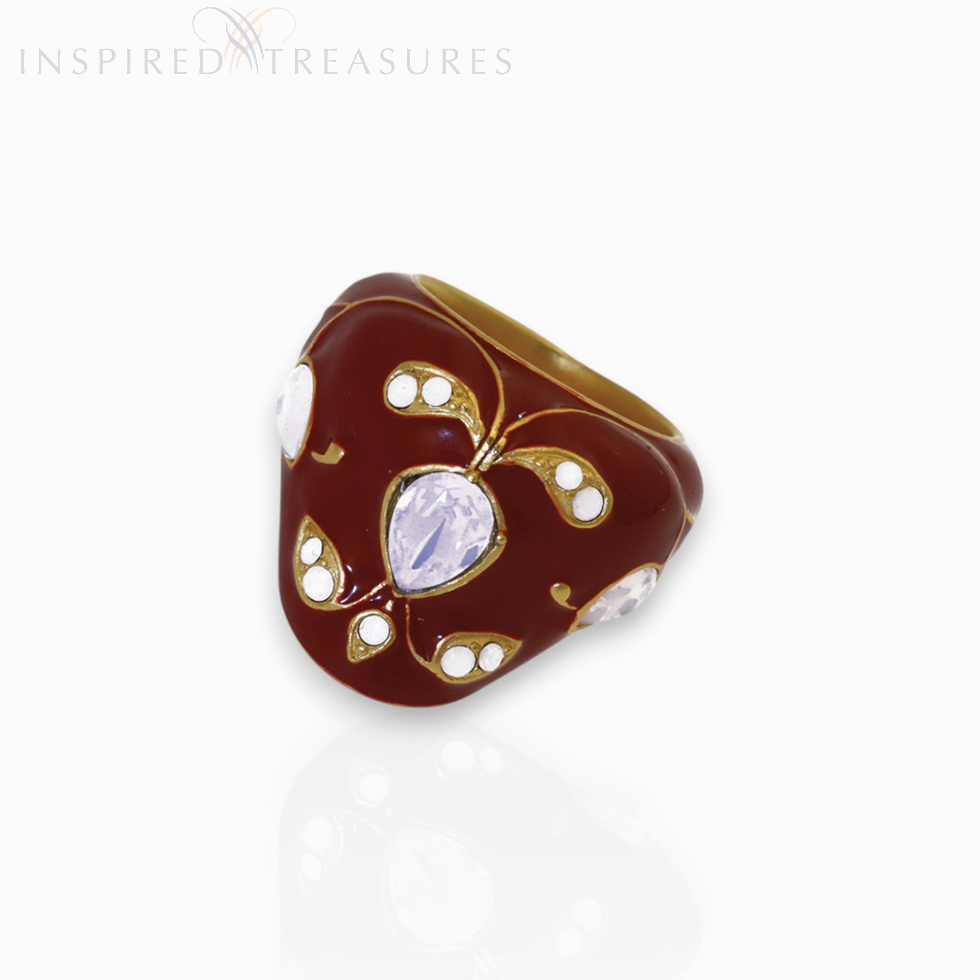 This ring is inspired by a magnificent gold thumb ring made in the Mughal Empire in the 18th century. This ring is gold-toned and hand-enamelled with bohemian crystals.