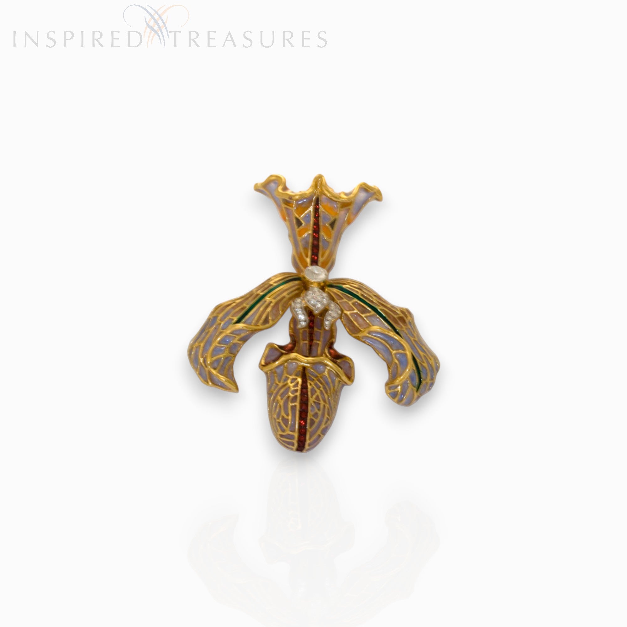 An orchid is a classic motif in jewellery design and this brooch evokes a beautiful 1902 orchid hair ornament by Philippe Wolfers of Belgium, one of the leading jewellers of the Art Nouveau style. This arresting design is 24 ct matt gold-plated, with Bohemian crystals and translucent enamel.