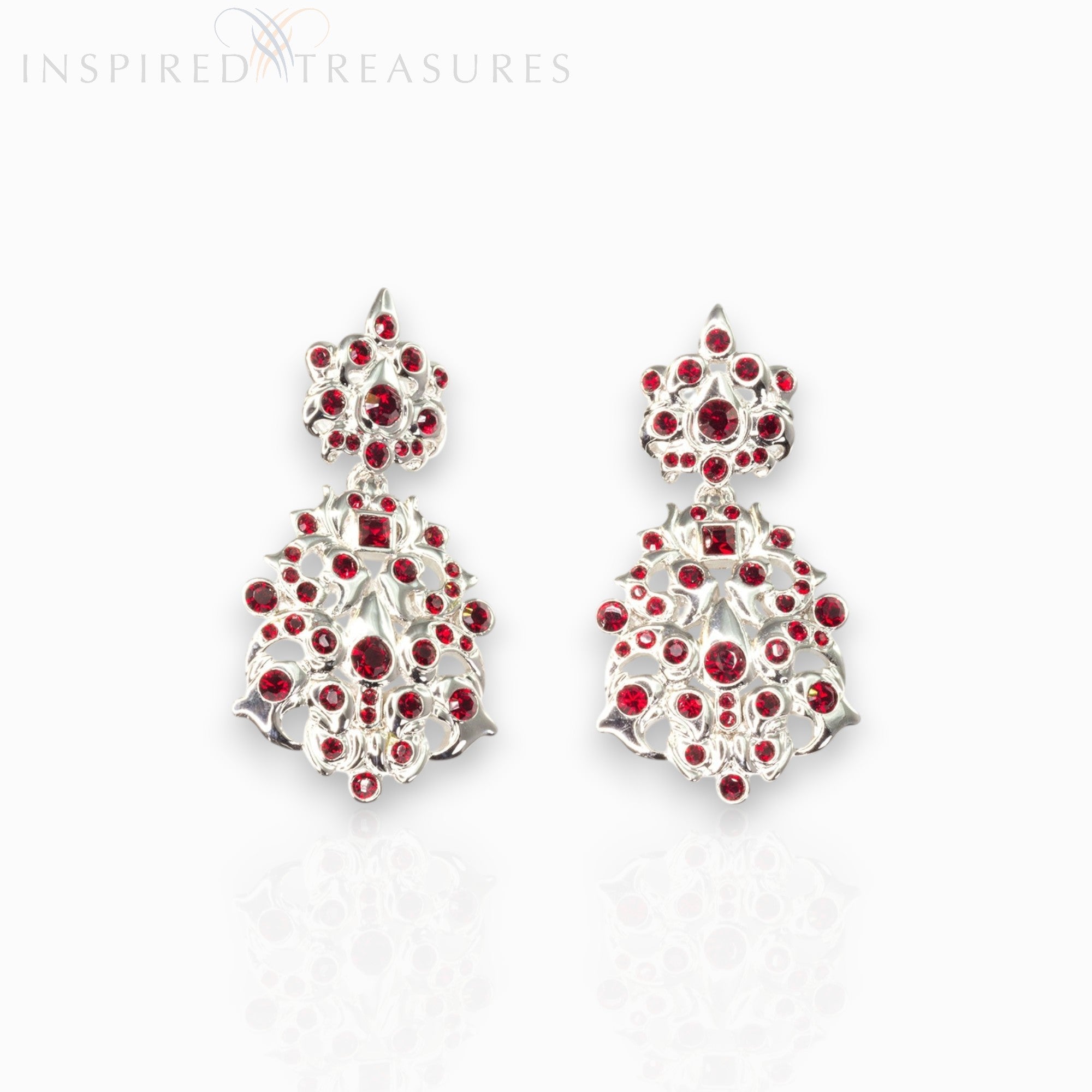 Red jewelled earrings - this wonderfully opulent design stems from a luxurious bodice ornament, possibly of Dutch origin, dating from 1660. The earrings are silver toned with rhodium with bohemian crystals. This item of jewellery comes with a Gift box, romance story card and care instructions.