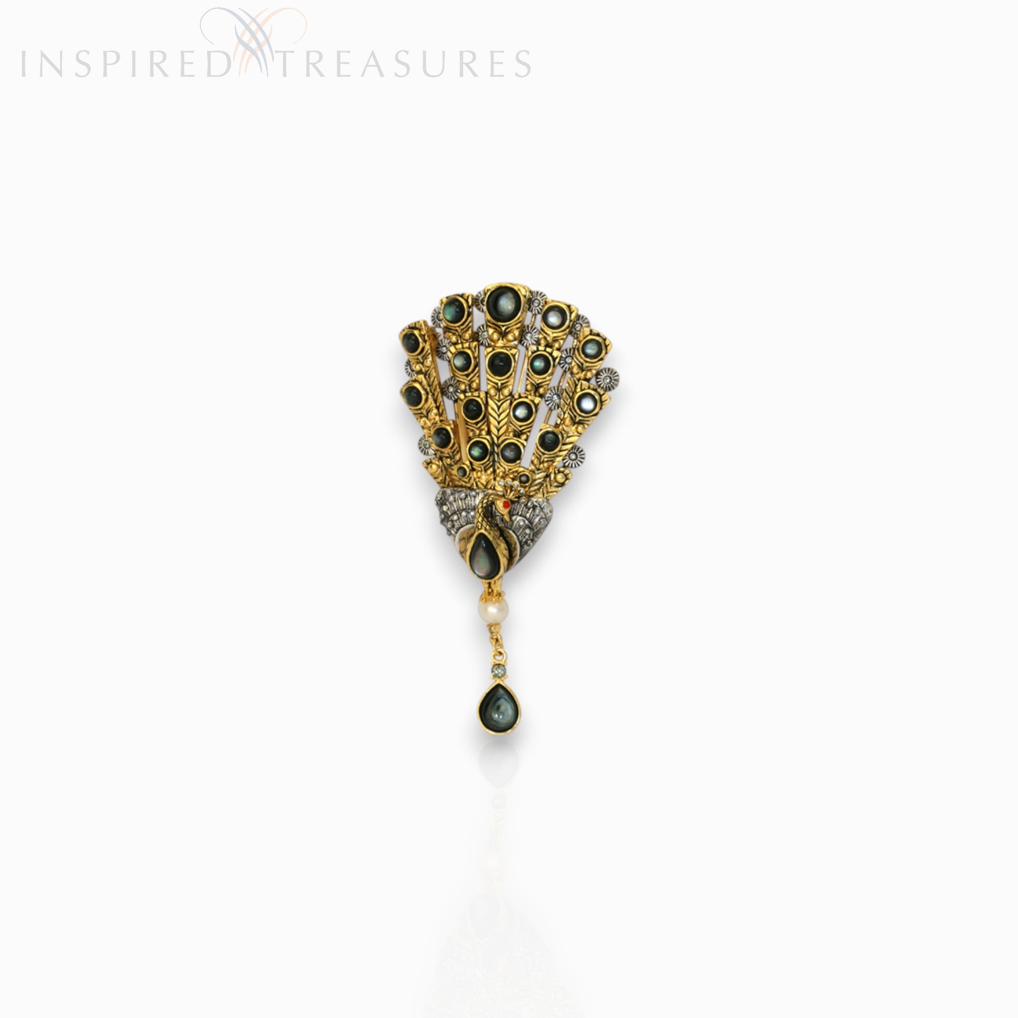 Peacock Brooch and Pendant with Chain: Peacock brooch - this dazzling brooch is gold-plated and set with bohemian crystals, fresh water pearls and mother-of-pearl. It is reminiscent of a design by C R Ashbee (1863-1942), made in silver and gold, set with diamonds and pearls, and capturing the magnificence of a peacock's display.