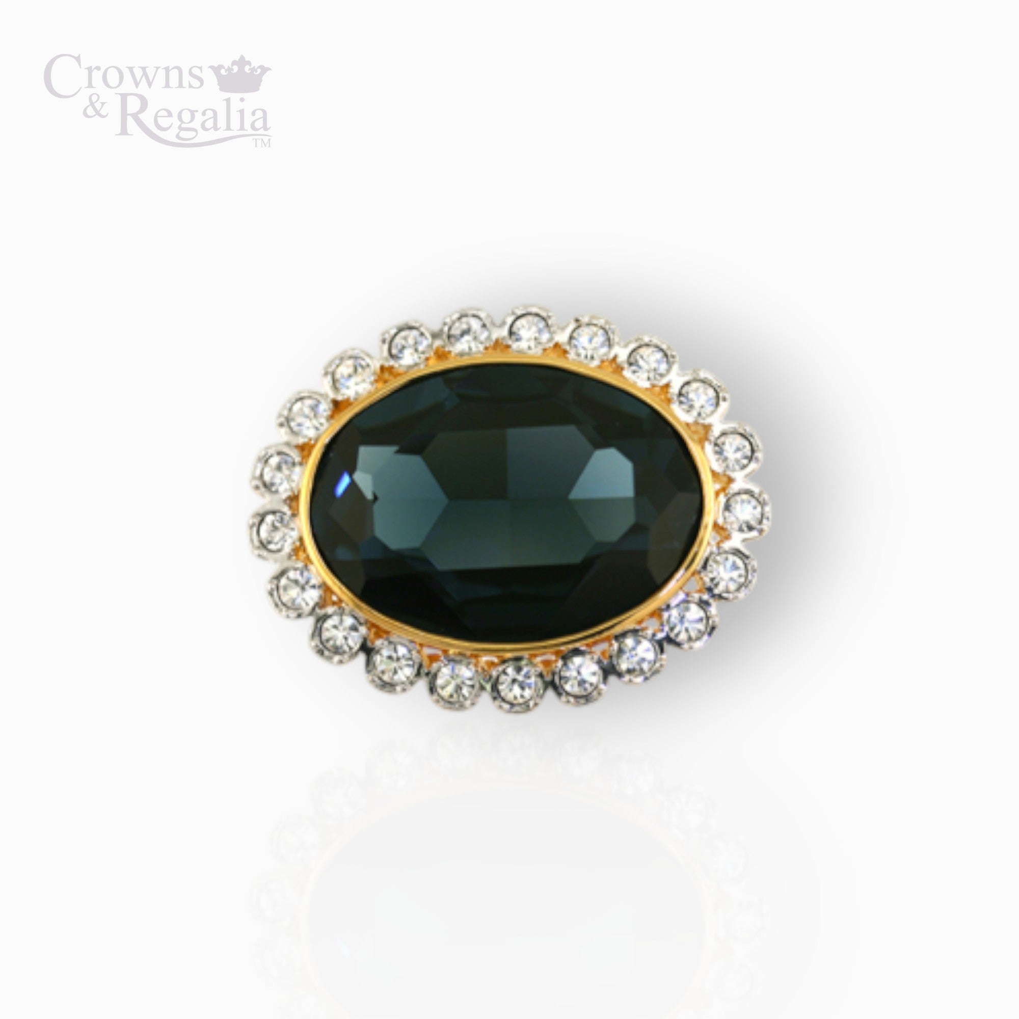 This gold-toned brooch features a central blue bohemian crystal and a halo of clear crystals.