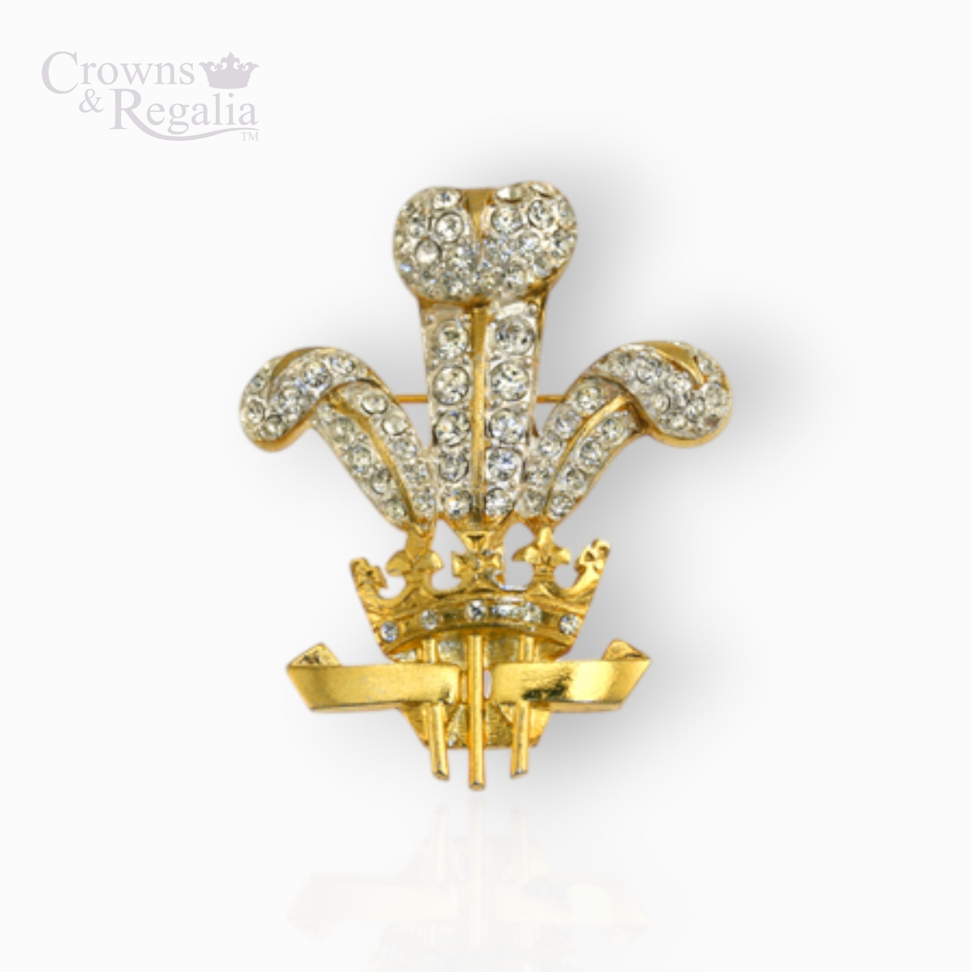 This brooch is inspired from a necklace worn by Princess Diana on many occassions with either an emerald or sapphire drop. Although the three feathers is commonly known as the Prince of Wales Feathers - it is actually the badge of the heir apparent, whether Prince of Wales or not. The badge comprises three silver ostrich feathers which rise through a coronet of crosses pattee and fleur-de-lisall gold, along with the motto ‘ICH DIEN’ (I Serve). The use of ostrich feathers in royal heraldry is first found during the riegn of Edward III. The circumstance of their adoption is obscure, but may have derived through the house of Hainault; Edward III married Phillipa of Hainault in 1329. The feathers were later adopted by the Princes of Wales. There have been twenty one Princes of Wales since the title was first used. Prince Charles was created Prince of Wales on 26 July 1958, aged 9, and Queen Elizabeth II invested him with the symbols of his office on 1 July 1969 at Caernarfon Castle.