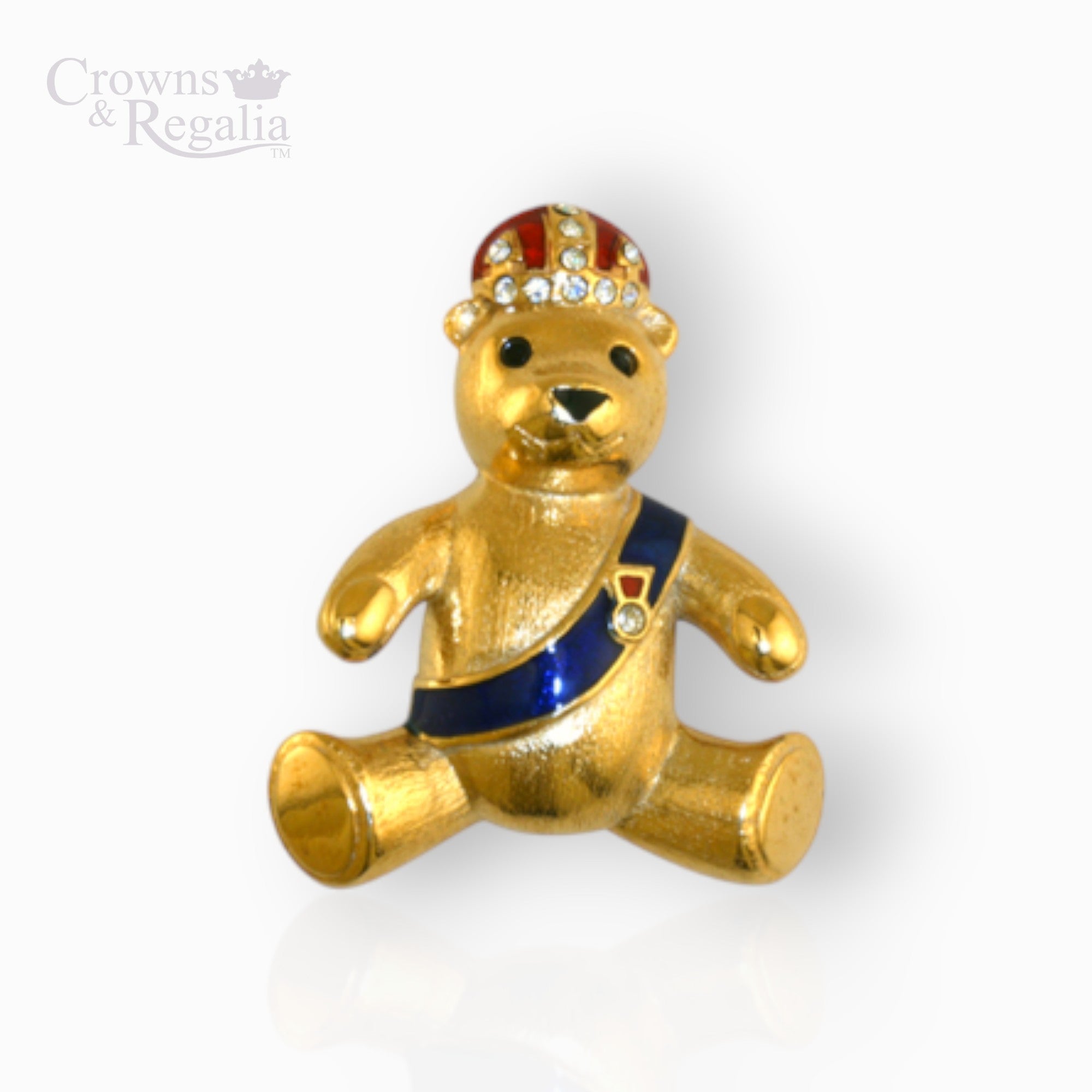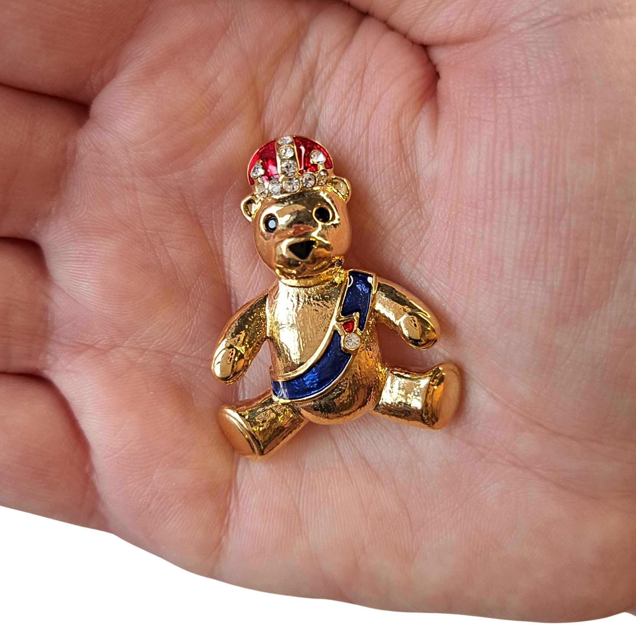 The Prince Teddy Bear Brooch is a delightful piece of jewellery that captures the essence of royal charm and childhood innocence. This handcrafted brooch features a teddy bear dressed as a prince, complete with a regal Order of the Garter sash and a coronet.