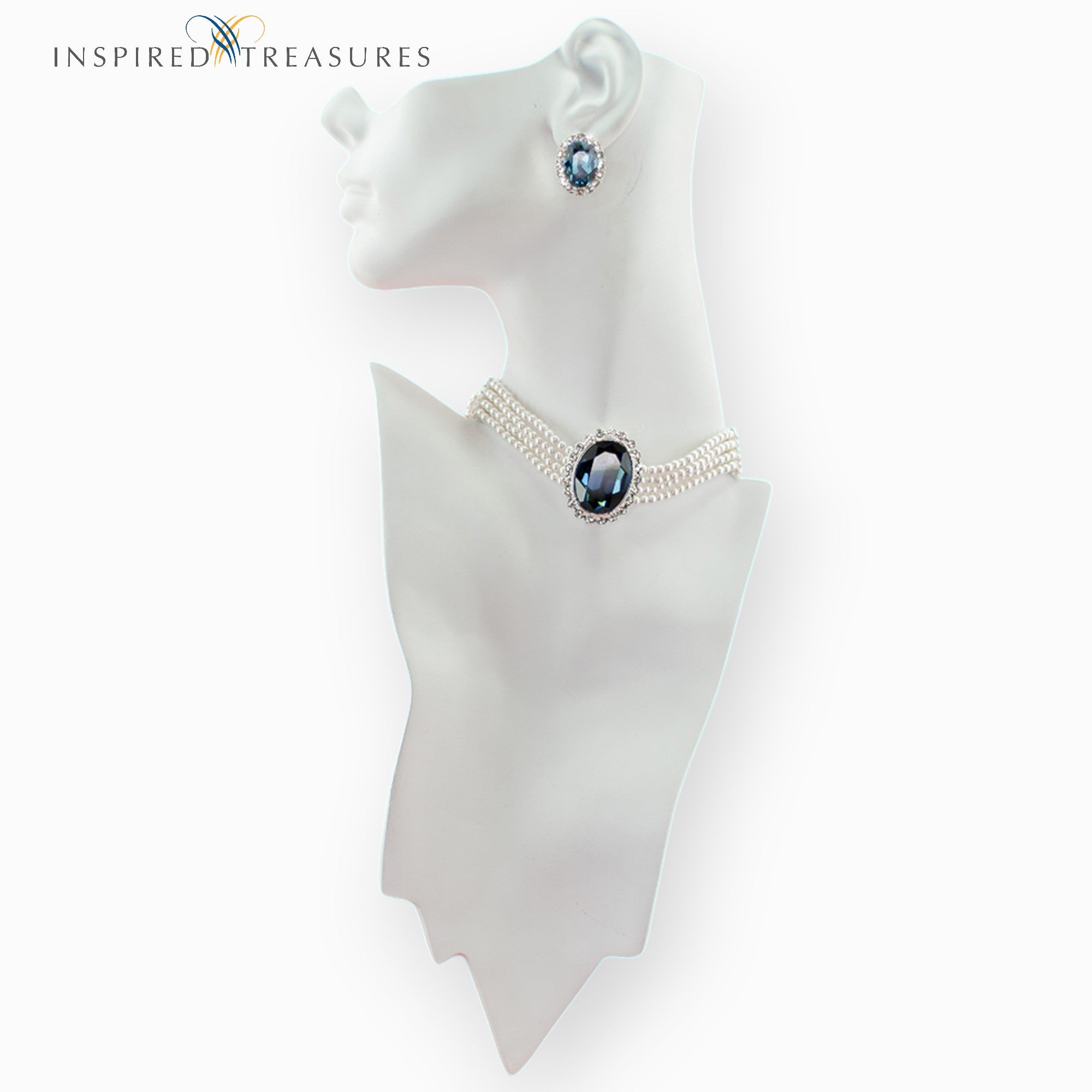 For her engagement to Prince Charles in 1981, Diana, Princess of Wales was given a large 20 carat sapphire brooch surrounded by two rows of diamonds as an engagement gift by Queen Elizabeth the Queen Mother. Not being the type of person to wear a brooch, Diana later added rows of pearls to the brooch and turned it into a choker which she wore often, most well remembered was the night she danced at the White House with John Tavolta in 1985. These earrings are inspired by her brooch.