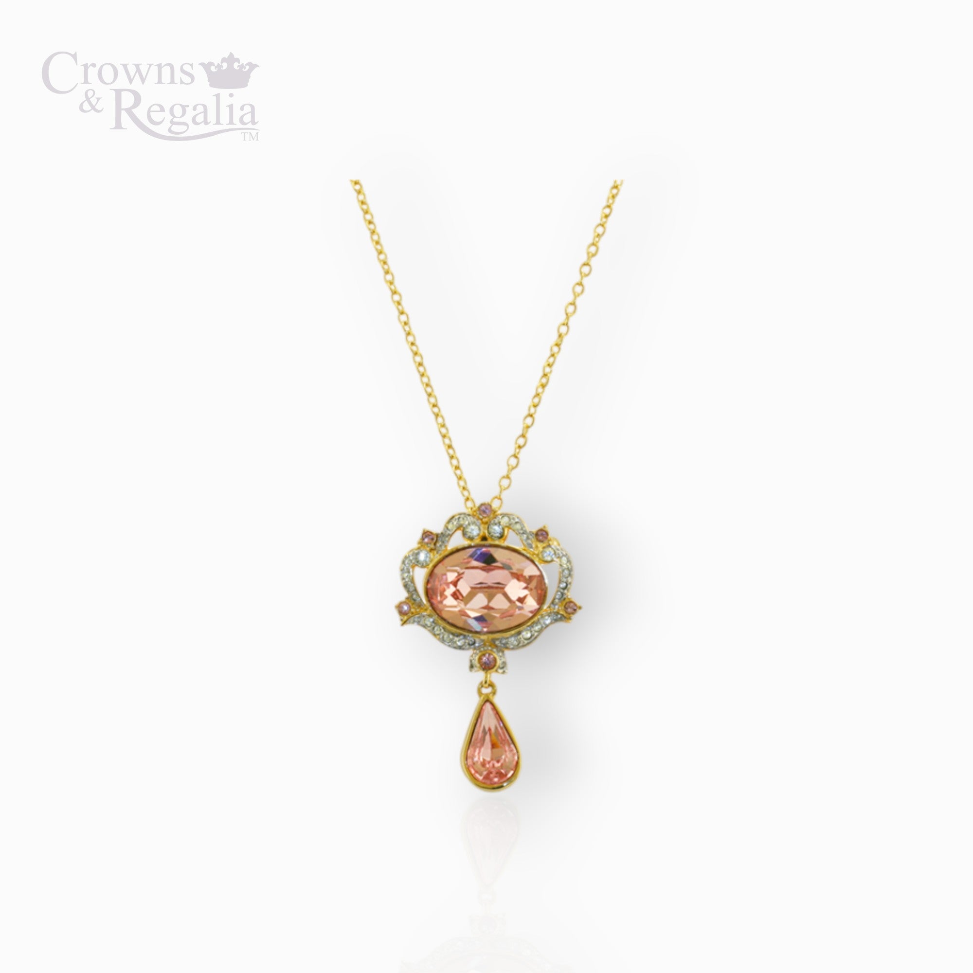 Inspired by a brooch with a central oval pink topaz with a scroll border of cushion-shaped diamonds suspending a detachable topaz and diamond drop mounted in silver and gold and made in about 1860. This was purchased by HRH The Princess of Wales, later Queen Mary, in 1901. This brooch passed to Princess Margaret and was sold at auction in 2006.