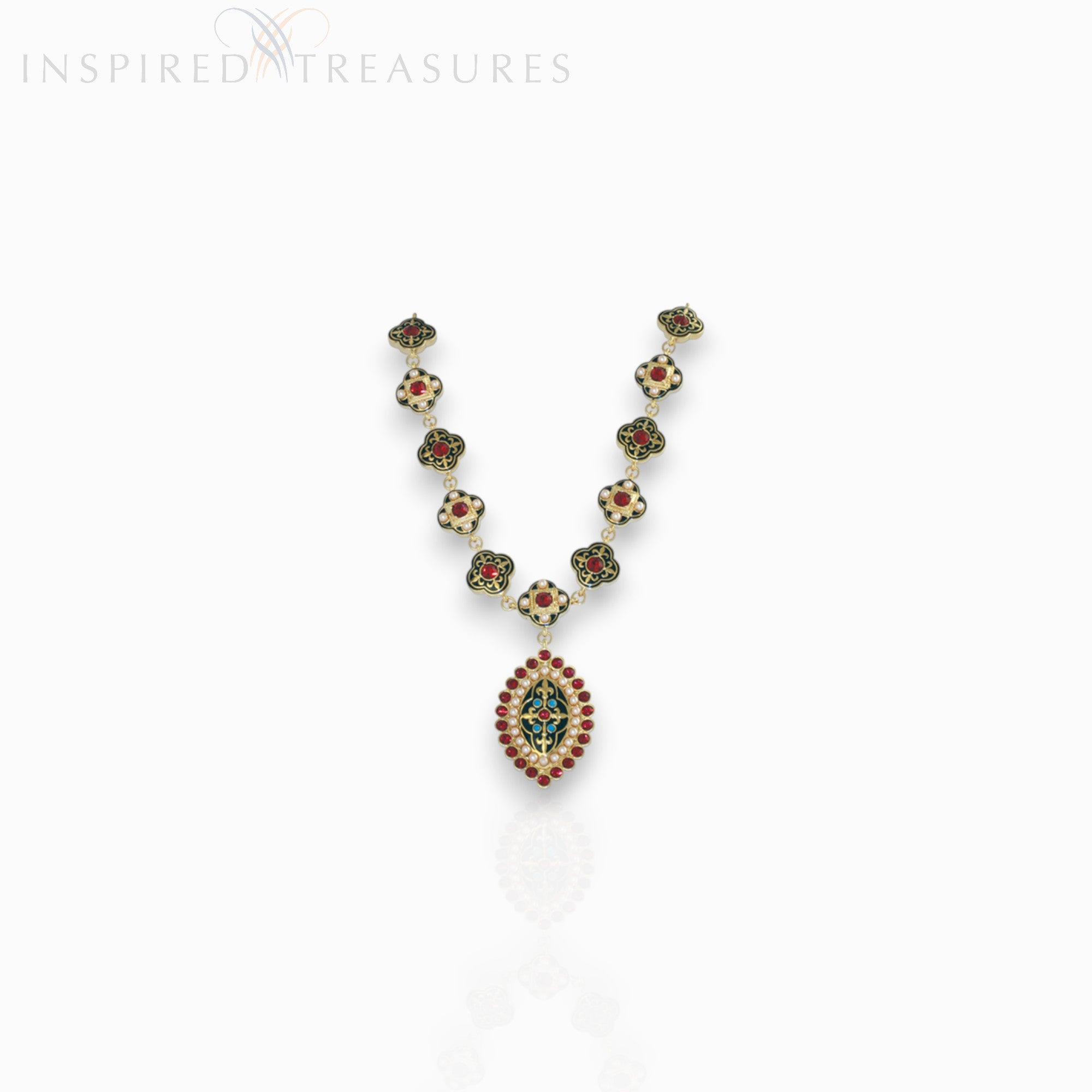 Pugin Medieval Style Necklace: A headband, brooch and necklace designed by Augustus Pugin in 1848 were the inspiration behind this quintessentially English range of jewellery. This necklace has a large gold-plated pendant with pearls and bohemian crystals.