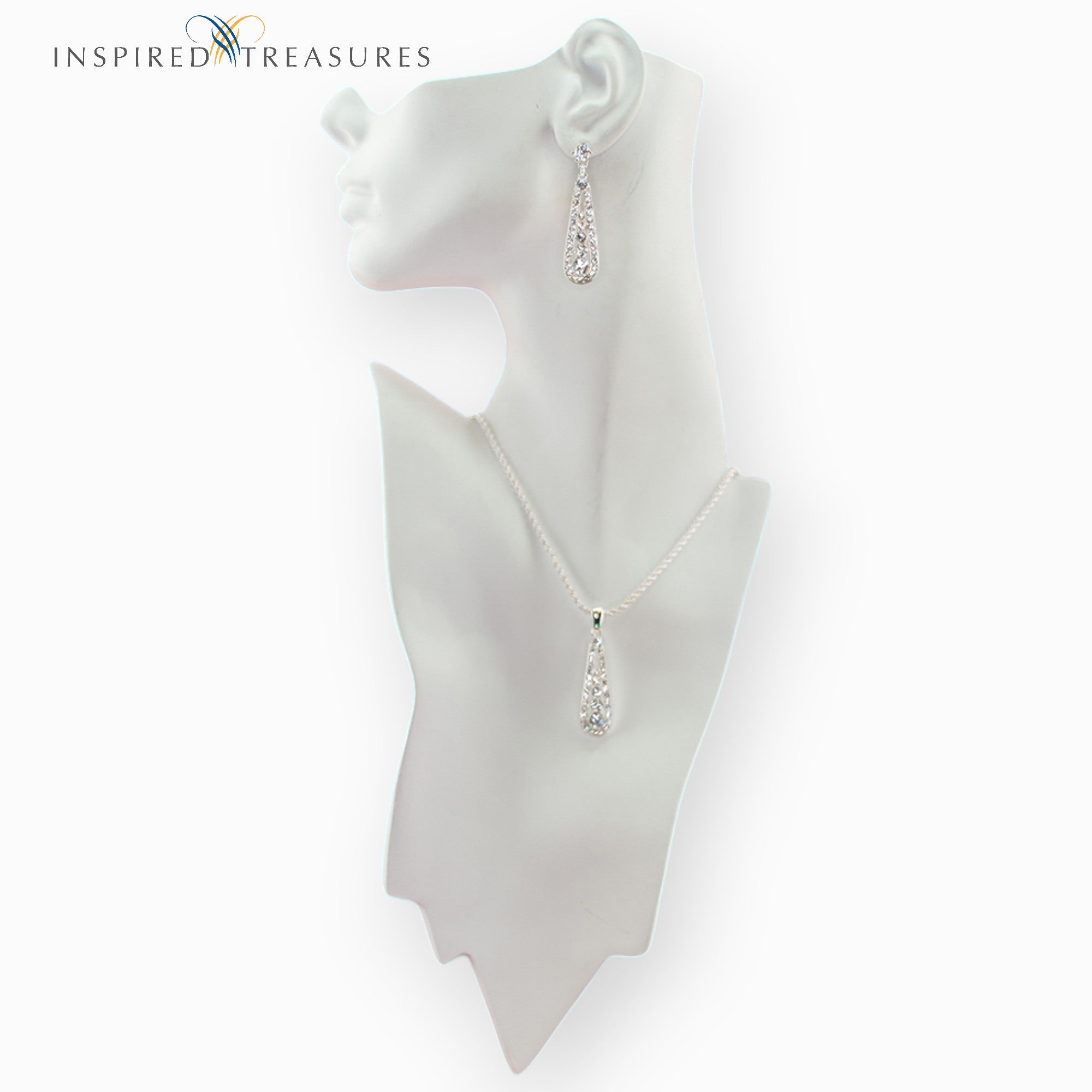 The necklace and earrings are handmade, silver-toned and set with bohemian crystals.