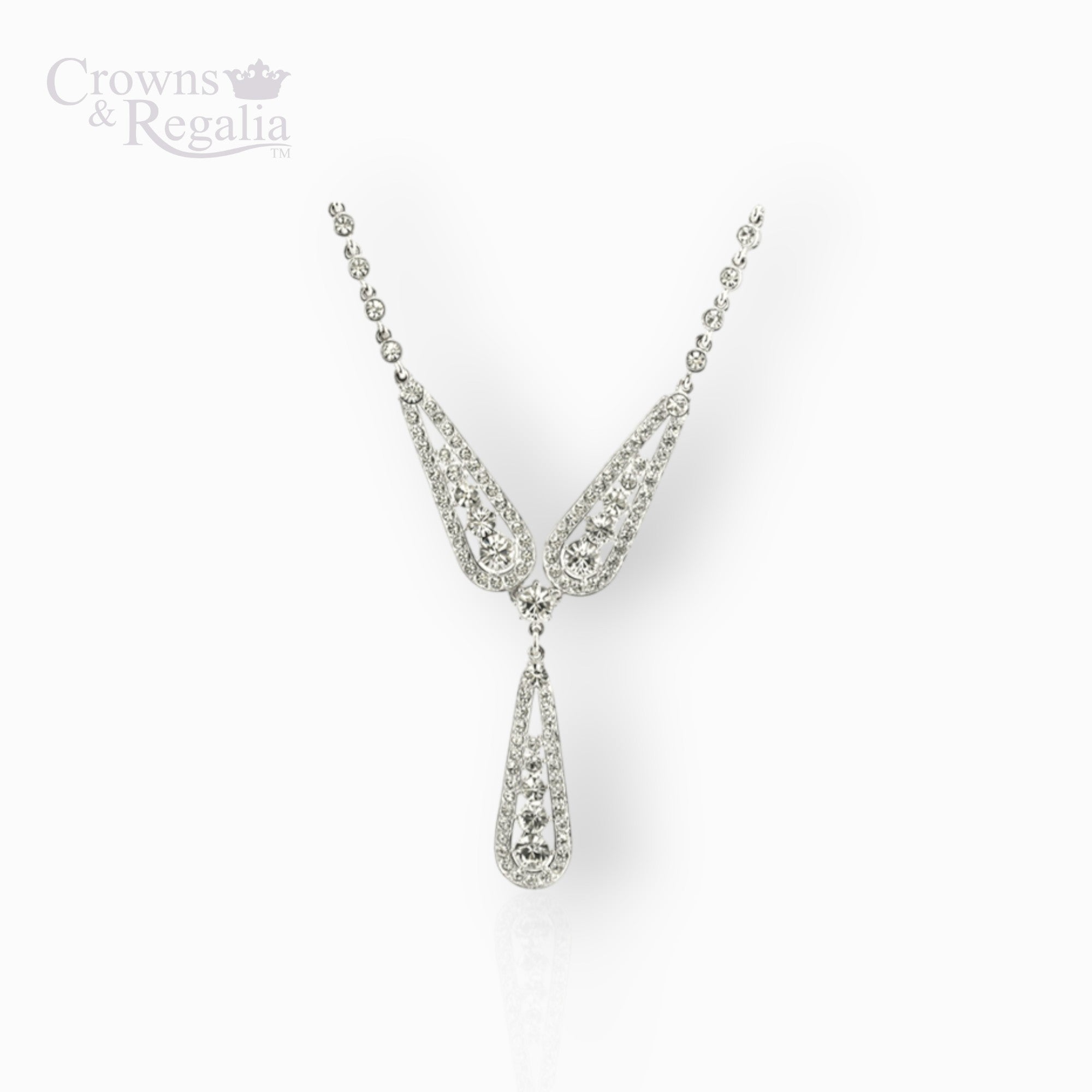 This necklace is inspired by the arches of the Crown worn by Queen Camilla at her Coronation on the 6th May 2023. The original crown, made by Garrard for Queen Mary in 1911 for her Coronation as consort to King George V, weighed 1LB. 7 ounces, and included over 2000 diamonds. Queen Mary presented it to the Crown Collection in 1914 with the intention of it being the future Queen consort's crown. It had been the tradition since Plantagenet times for a Queen not to attend the coronation of her successor. Queen Mary broke with this tradition in 1937, probably to show solidarity after the abdication of King Edward VIII, and wore the crown as a circlet without arches. For the Coronation of Queen Camilla there were only 4 arches instead of the original 8 and whereas Queen Mary's crown was originally set with the Koh-i-Noor in the centre front cross, Cullinan III in the top cross, and Cullinan IV in the front of the band, the Camilla crown replaced the Koh-i-noor with the Cullinan V diamond.