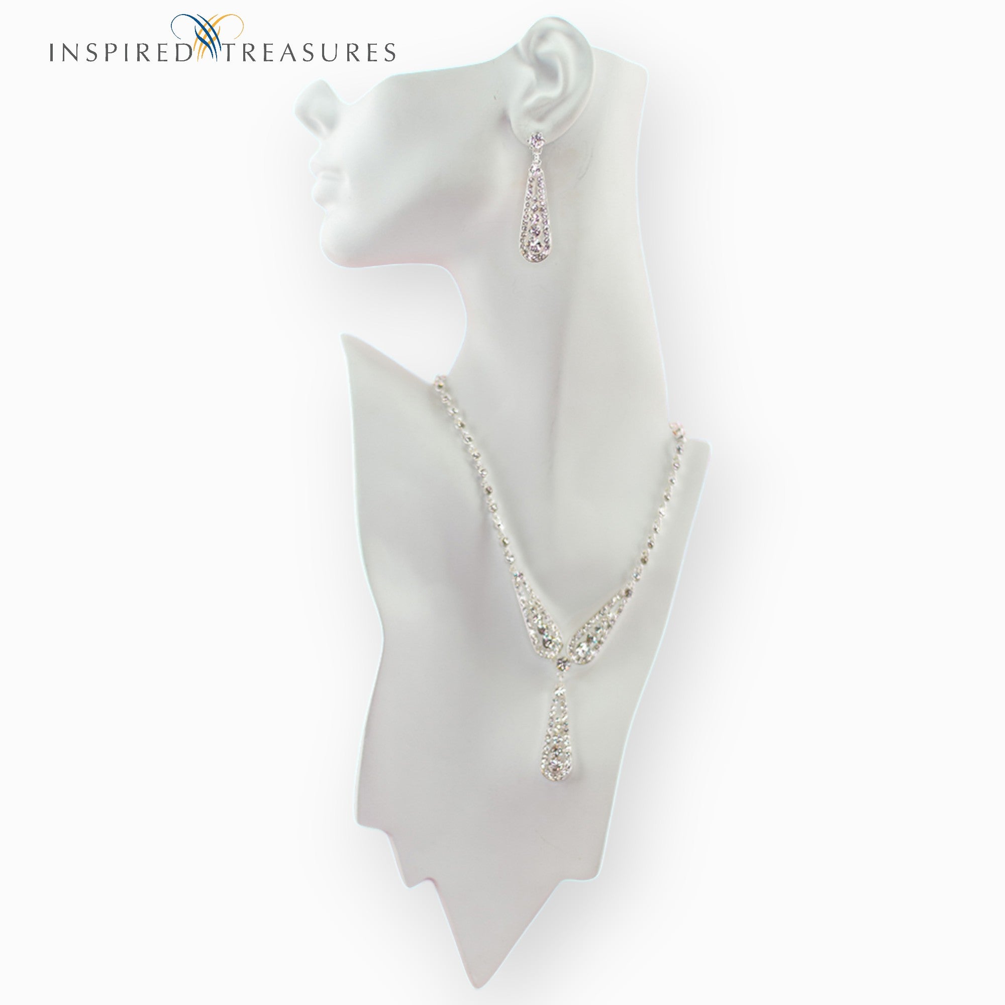 The necklace and earrings are handmade, silver-toned and set with bohemian crystals.