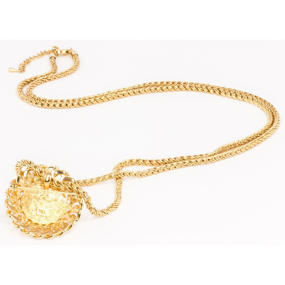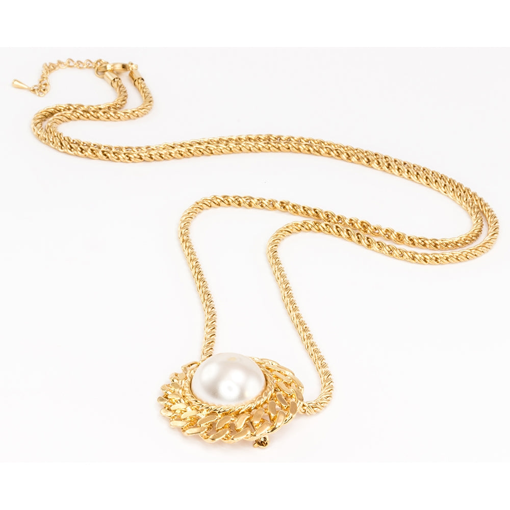 Rope and pearl pendant - an elegant design evoking the haute couture era of the 1950's. The pendant uses the classic combination of pearls and gold-plated ropes and chains, both around the centrepiece and in the neckchain itself.