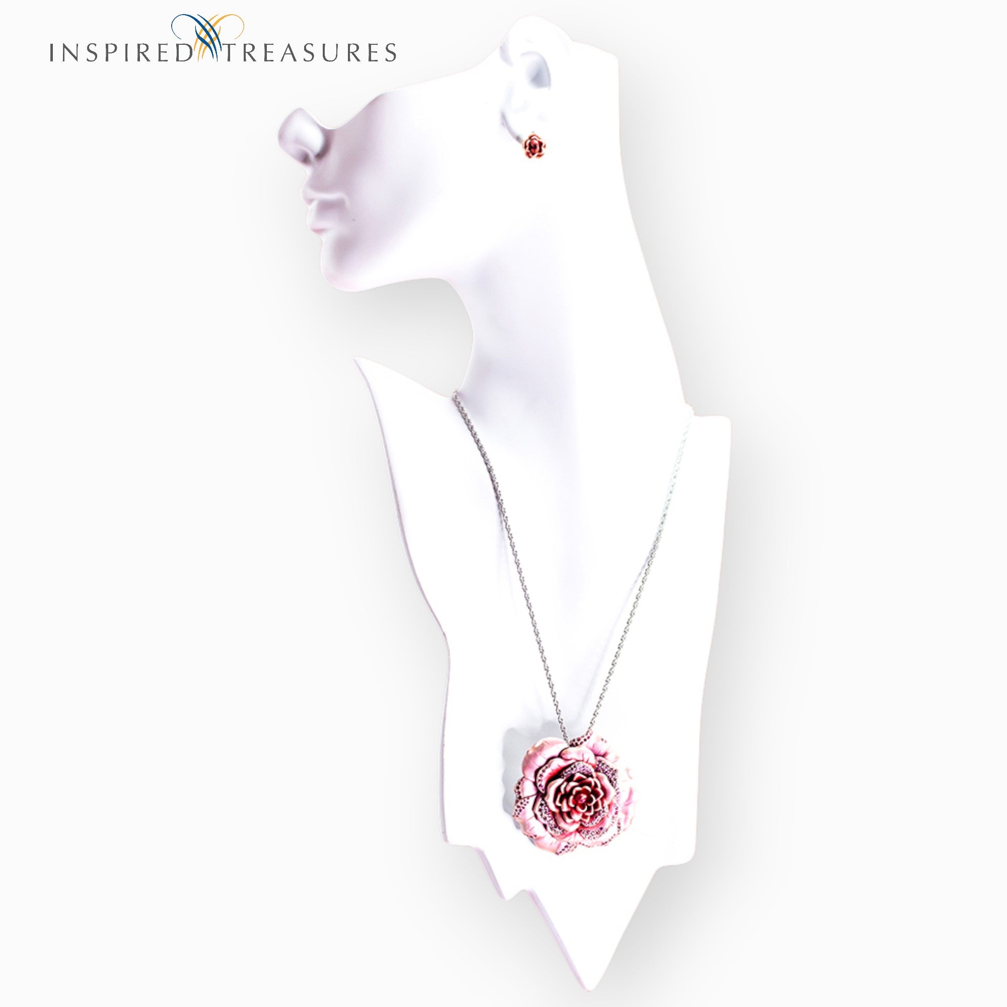 This is a beautifully hand-enamelled and bohemian crystal-encrusted silver-toned rose pendant. Make a unique floral fashion statement today.