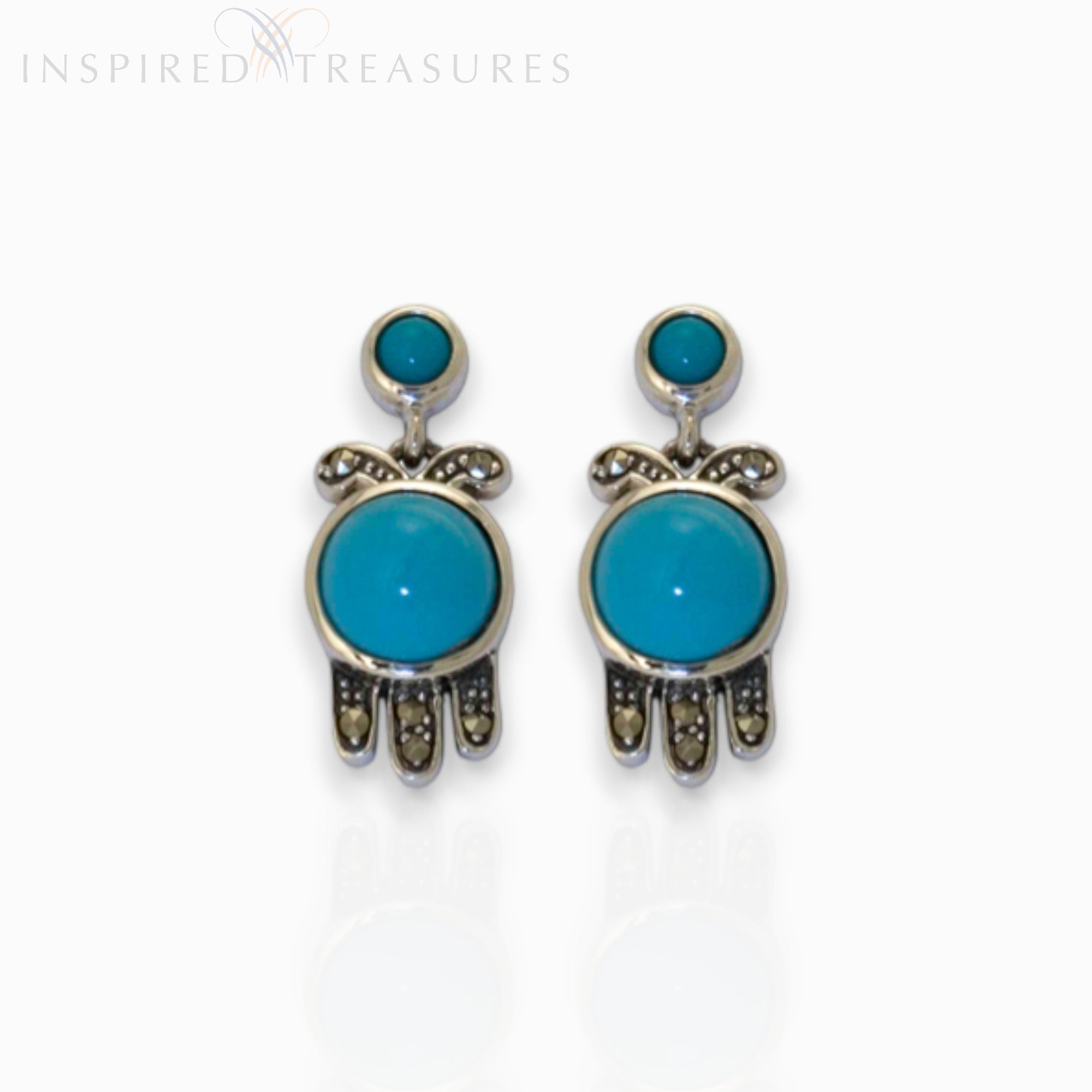Art deco rings - inspired by a set of jewellery retailed by Janesich, Paris c.1925, these timelessly alluring earrings are antiqued silver (3.254 gms) with 12 marcasites and 2 synthetic turquoise cabochons. They match the rings in the same art deco range.
