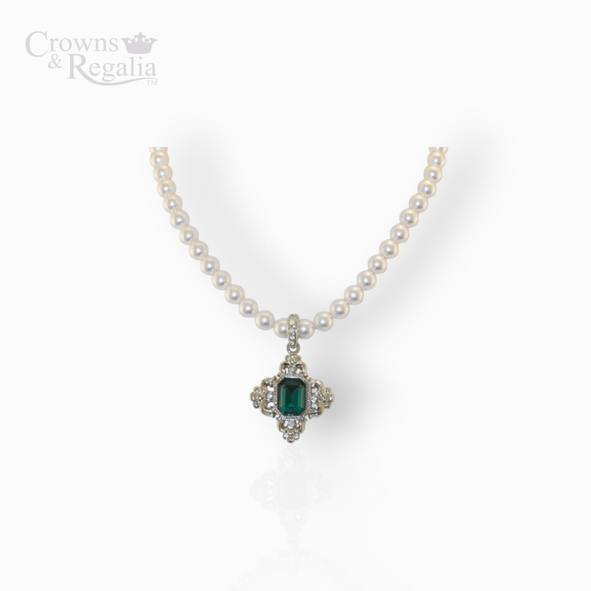 This stunning necklace is inspired by the St Edward's Crown, a symbol of the British monarchy's power and authority. The design features a beautiful pearl necklace with a gemmed pendant that captures the elegance and regal essence of the crown.