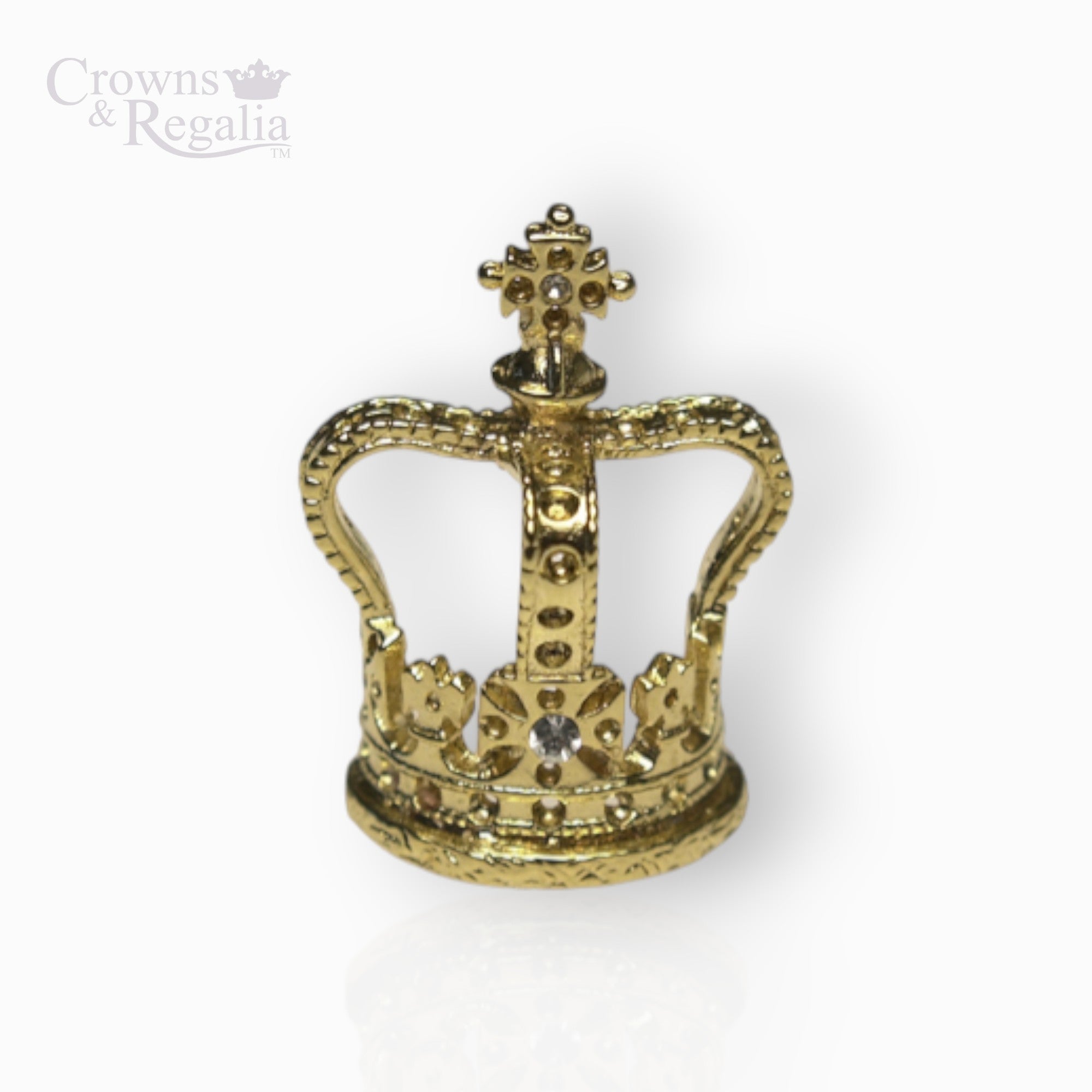 This stud pin is based on the actual Coronation Crown, which is made of gold, set with precious and semiprecious stones, and weighs five pounds. It is reputed to contain the gold from the crown of Edward the Confessor. During the time of Cromwell, most of the Crown Jewels were melted into coinage, but it would appear that the original crown was saved, and incorporated into this crown made for the Coronation of Charles II in 1661.