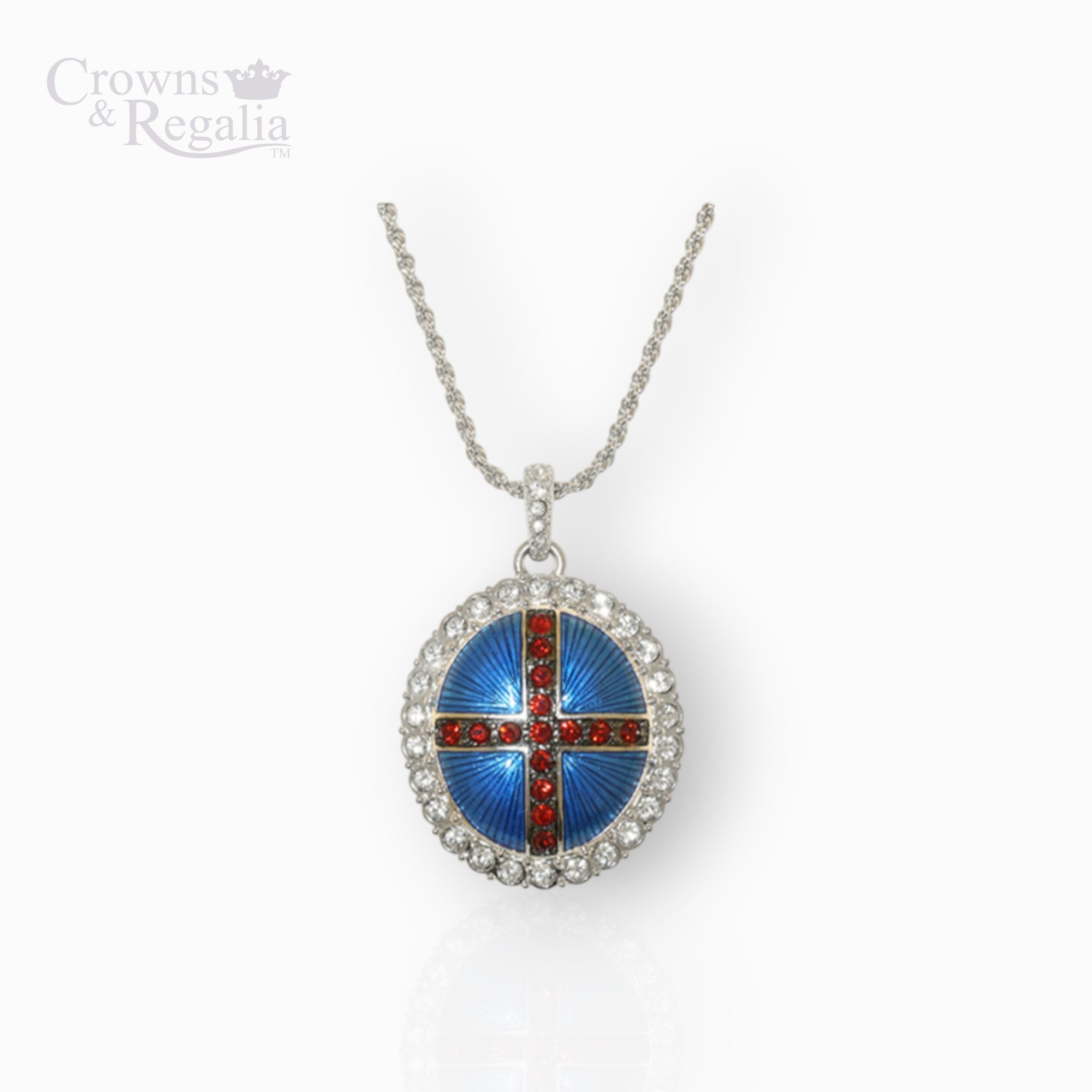 At the heart of this captivating pendant lies a cross of scintillating red Bohemian crystals, carefully set against a vibrant blue backdrop. The juxtaposition of red and blue not only captivates the eye but also adds layers of symbolism. Red, traditionally the colour of passion and courage, is complemented by blue's serenity and wisdom, resulting in a design that reflects both the grandeur and the duty associated with sovereignty.