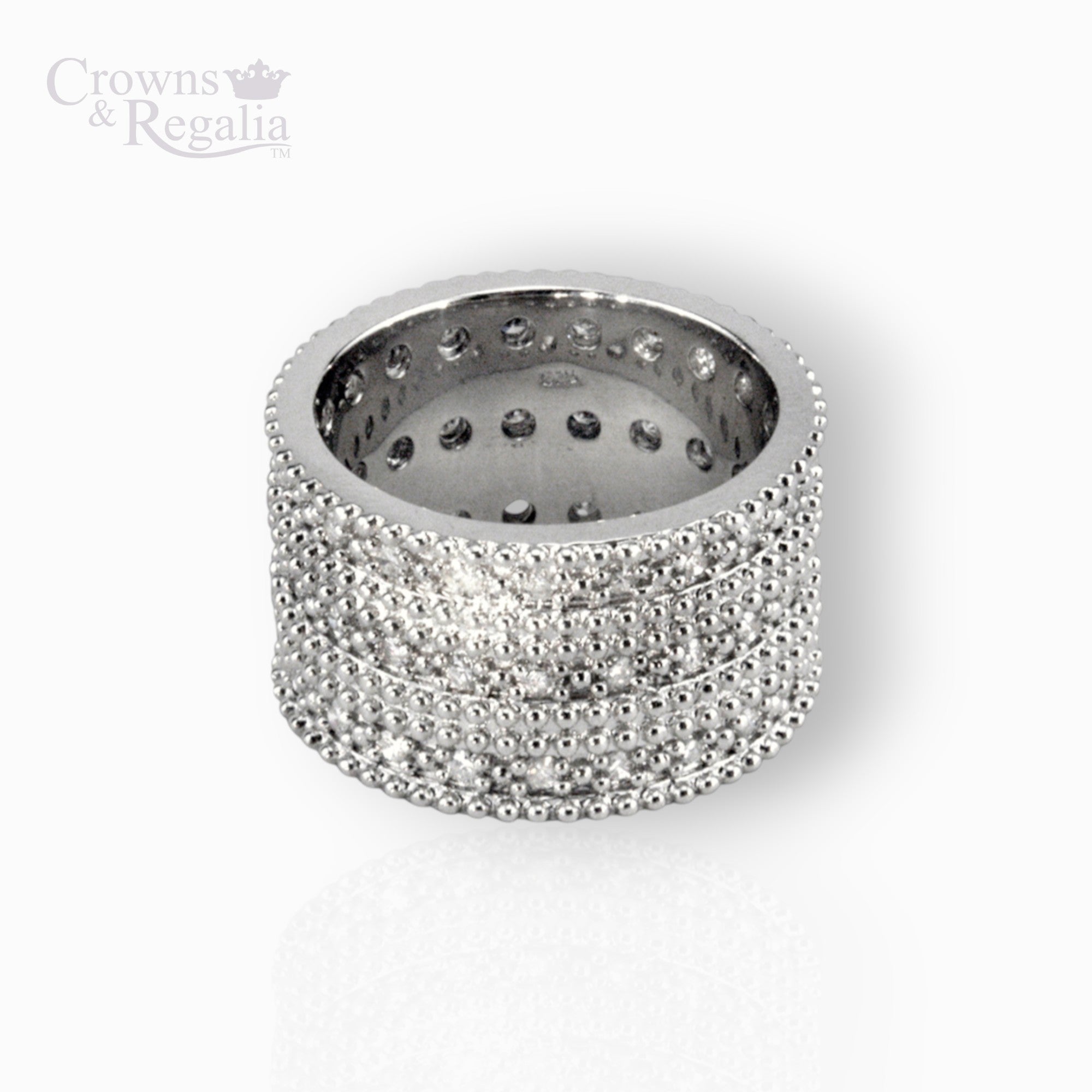 This ring is inspired by the George the IV Diadem. From its frequent appearance on postage stamps and coins, this exceptionally beautiful head ornament, incorporating the national emblems of England, Scotland and Ireland, is probably the most familiar piece of British royal jewellery. This ring is made from brass, rhodium-plated and adorned with bohemian crystals.