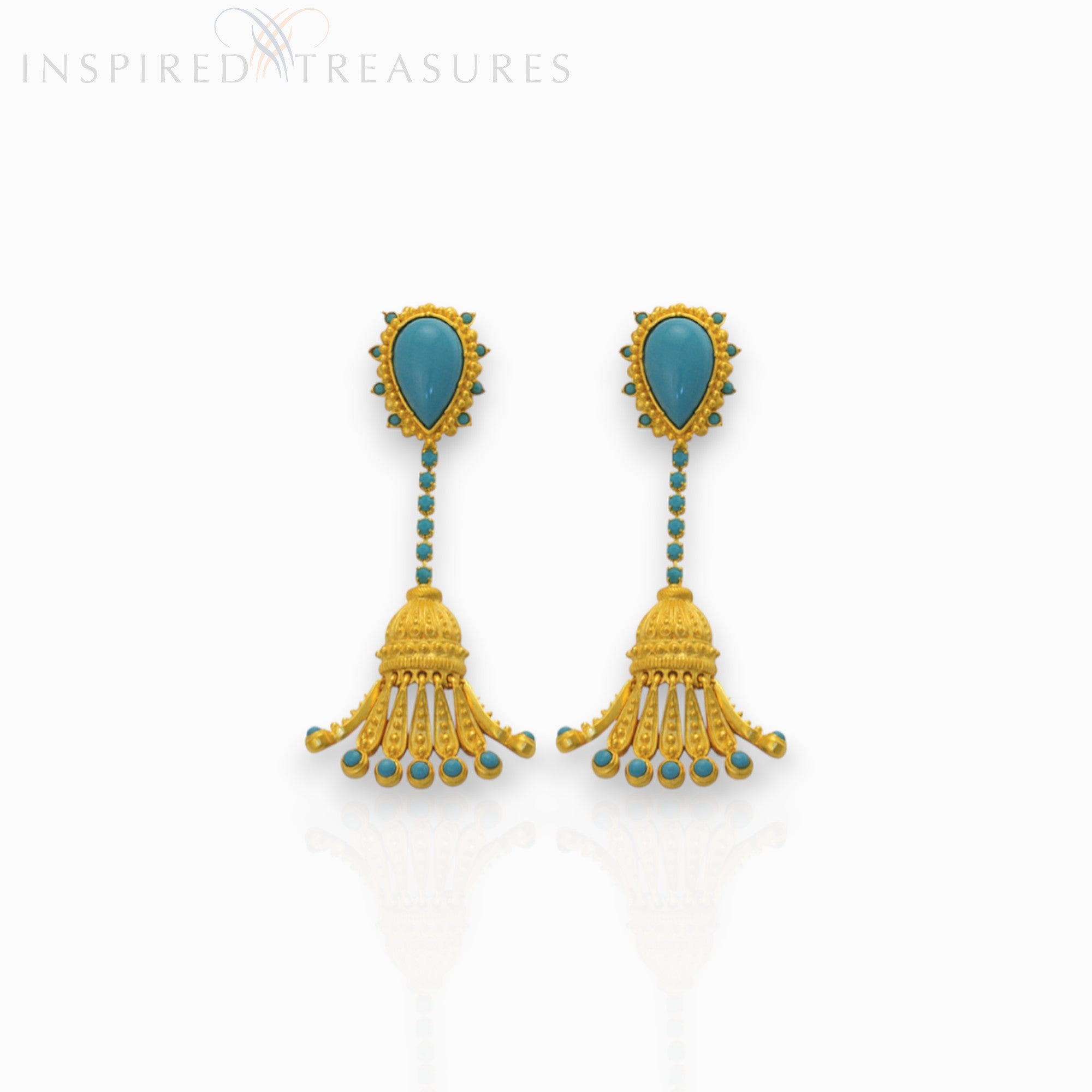 Turquoise Tassel Earrings: This necklace consists of turquoise and gold-plated bell shaped tassels which move individually with the wearer, fashioned after the style of a West European design dating from 1835-1840.