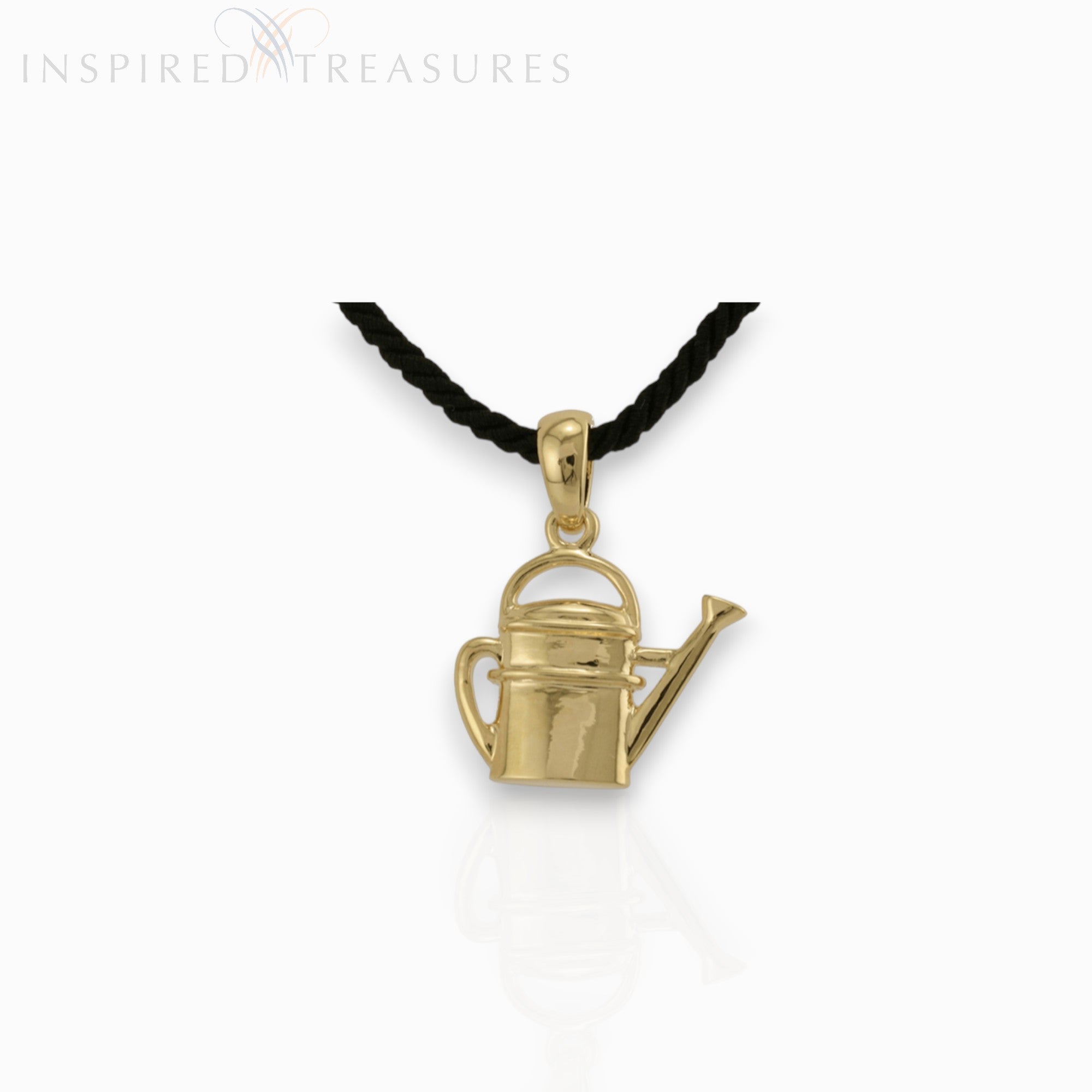 A lovely gold-toned pendant featuring a charming watering can, perfect for garden enthusiasts.