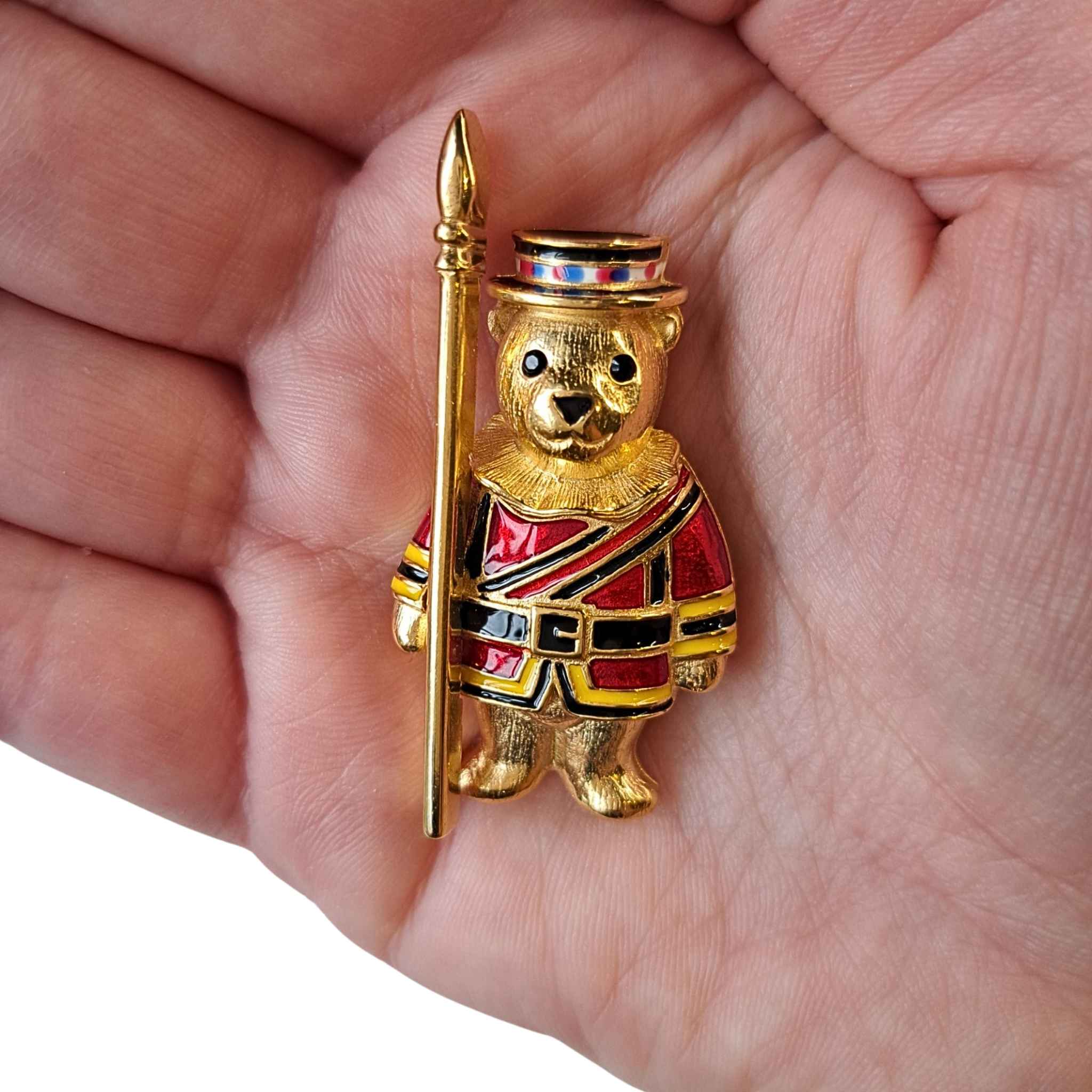 This charming Yeoman Teddy brooch forms part of our range of beautifully hand-enamelled Royal Teddies. These are cast in pewter, gold-plated and enamelled by hand in England.